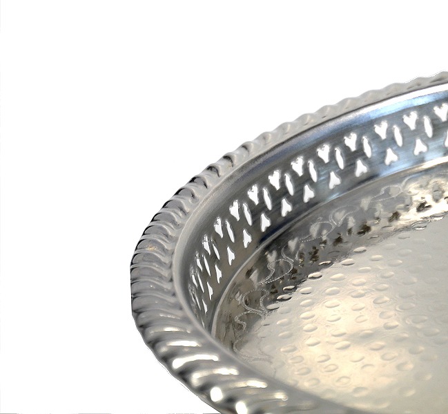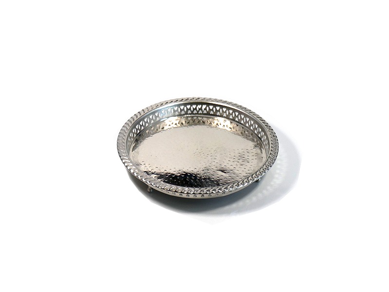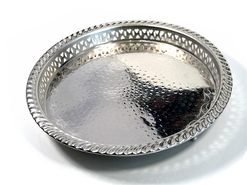 Plateau rond artisanal marocain en métal argenté cerclé et délicatement ciselé avec pieds (35 cm) - REF. 29818 (22.00 €)
