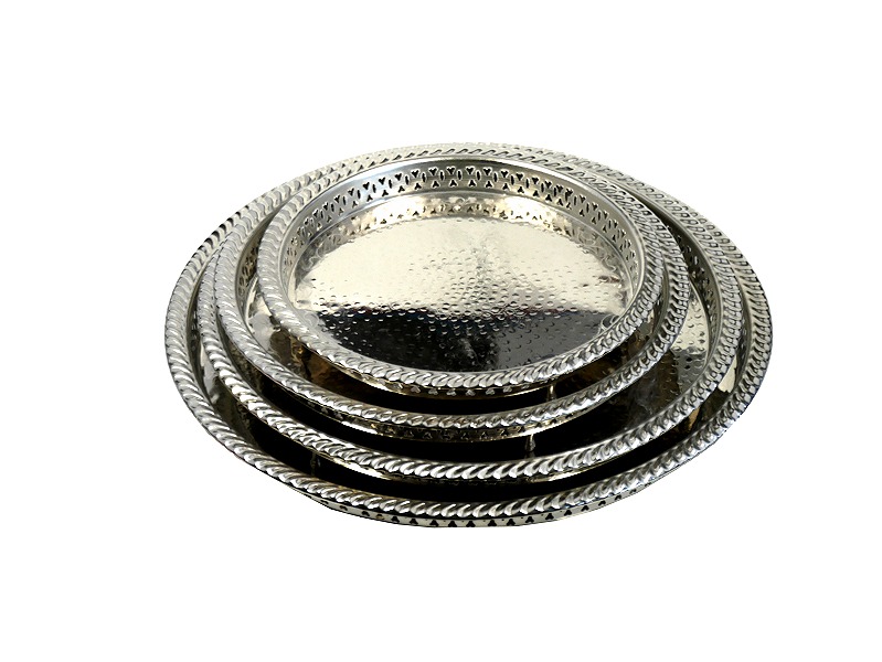 Plateau marocain rond de fabrication artisanale en metal argente cercle et finement martele avec pieds - diametre 30 cm