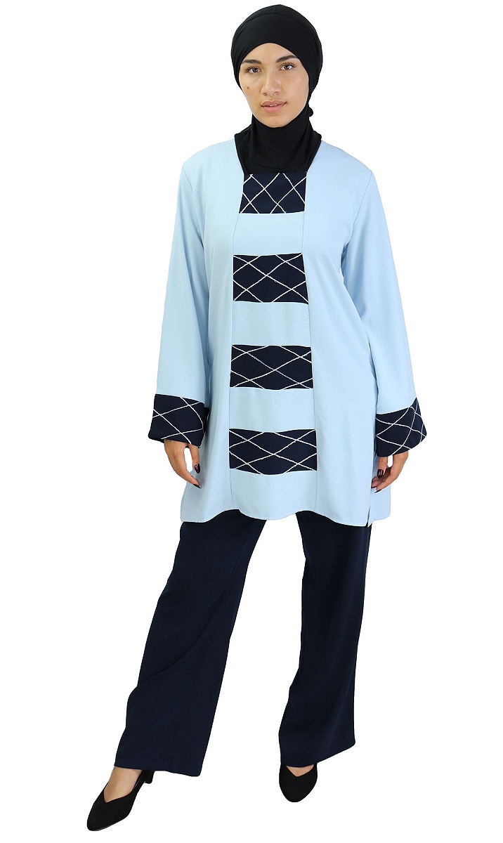 Ensemble (tunique-pantalon) en lin. Pantalon droit très facile à porter, taille élastiquée. Tunique fluide, encolure carrée, manches longues.