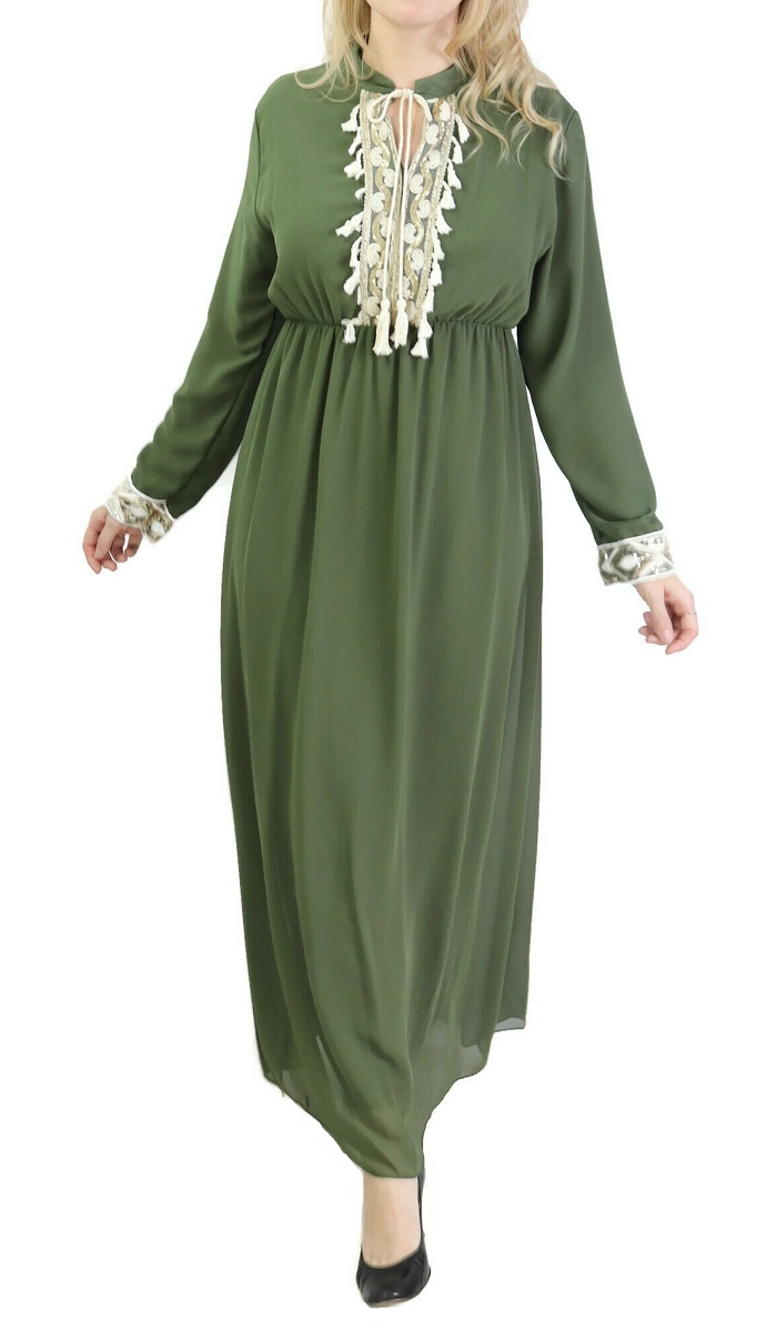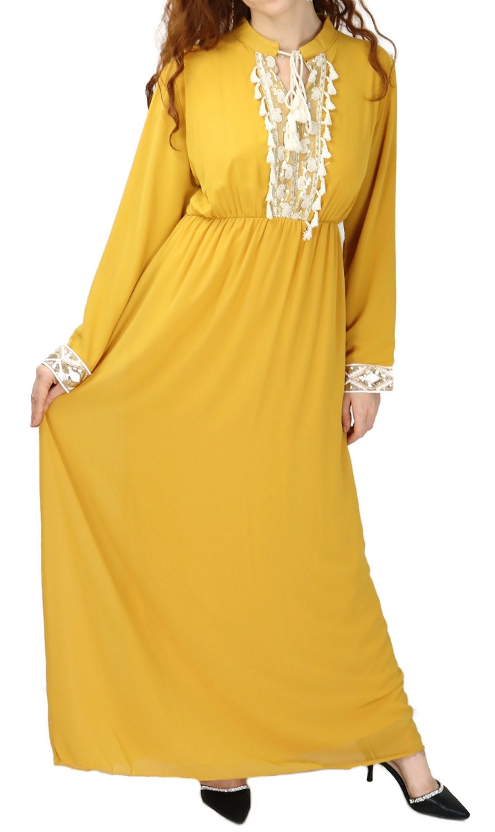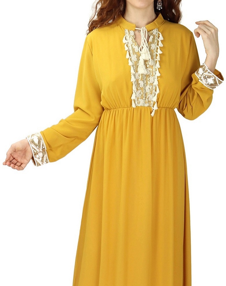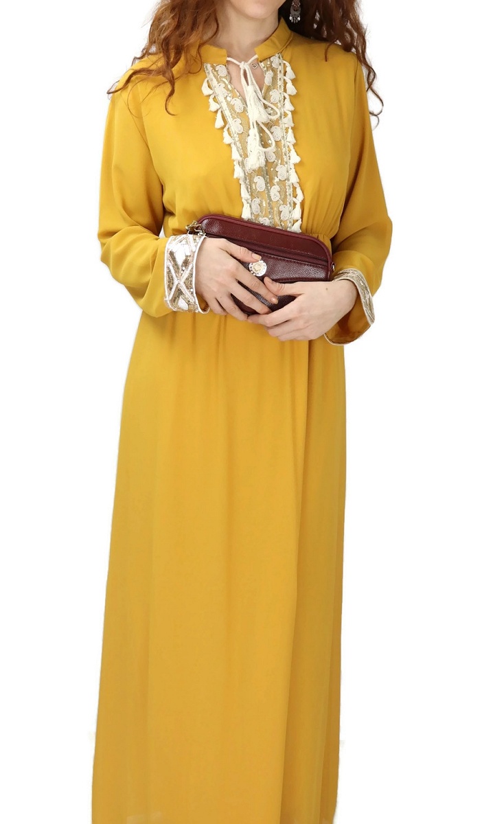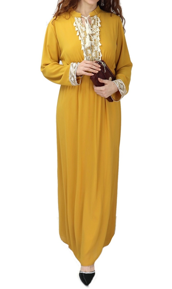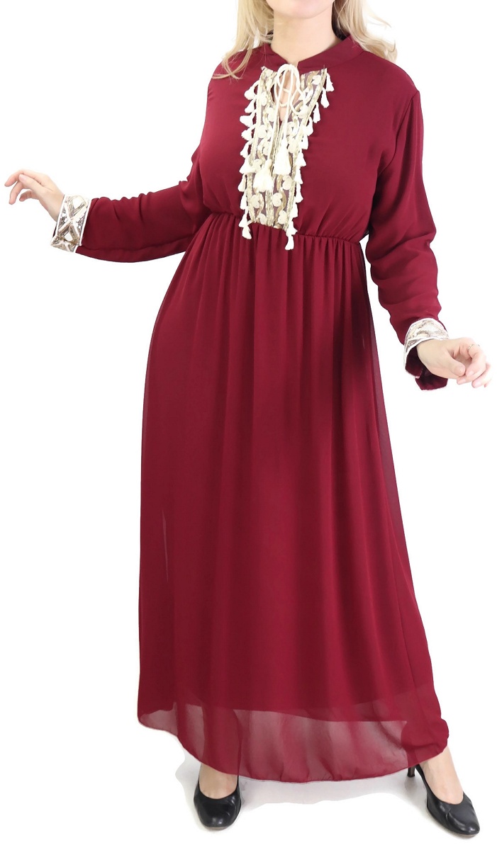 Robe col Mao dotée de cordons avec pompons, broderie et strass dorés devant et aux manches, taille élastiquée. Entièrement doublée.