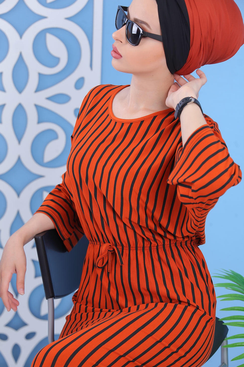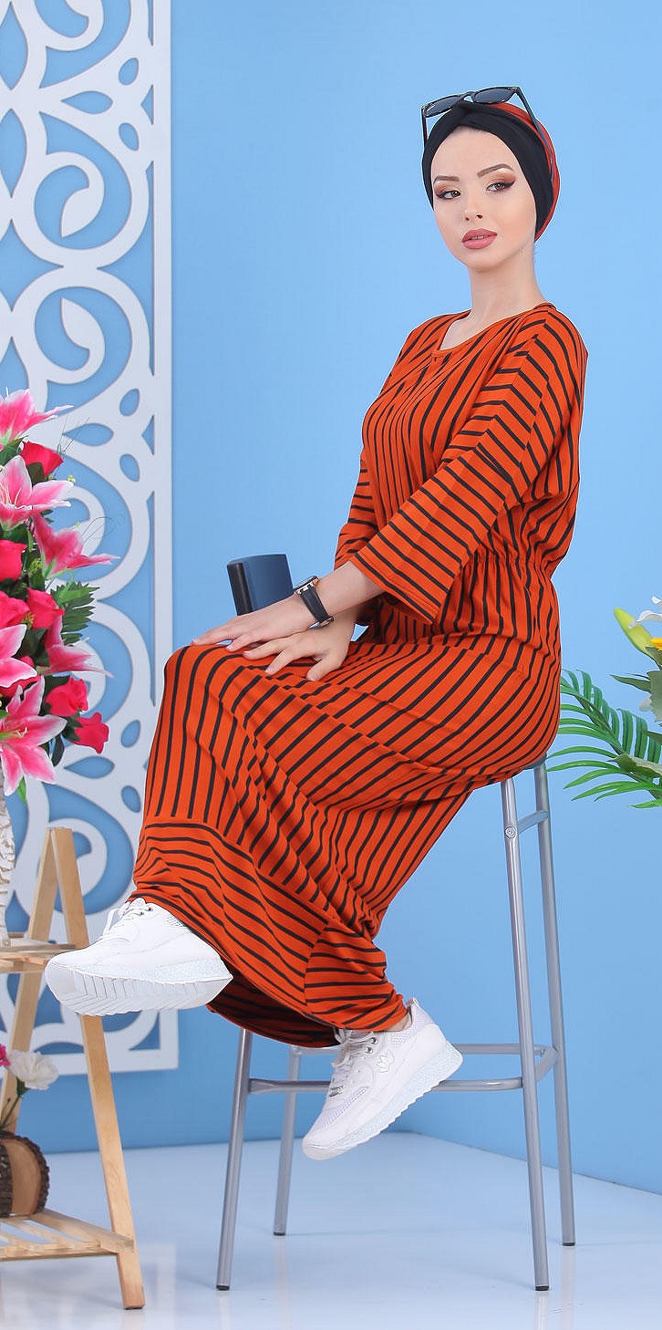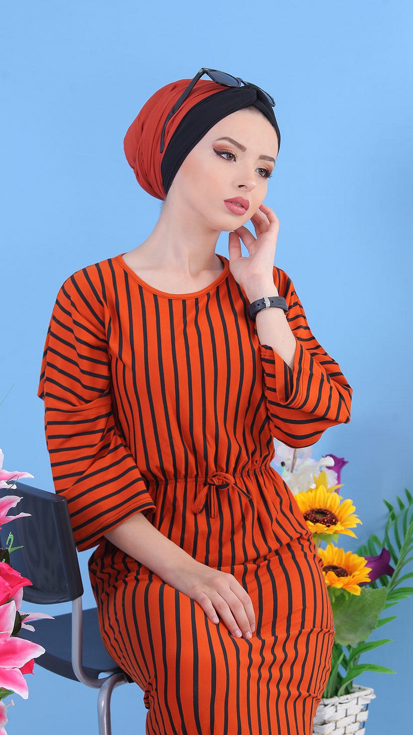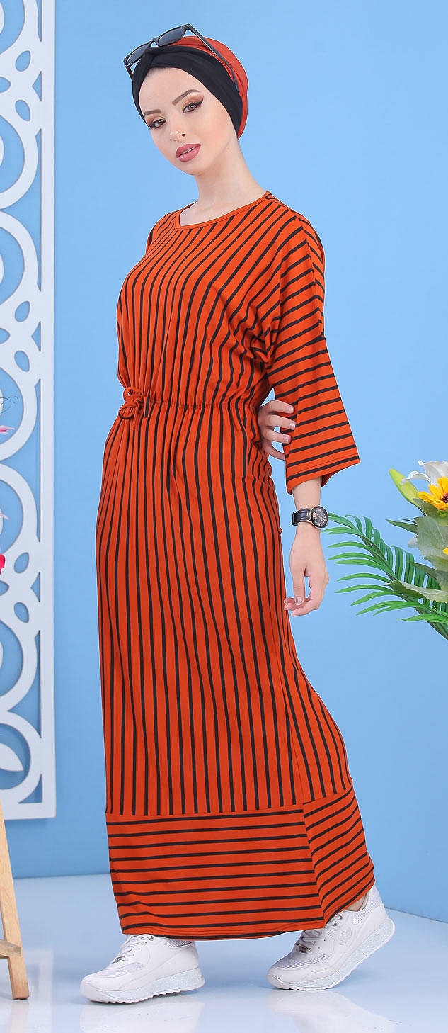 Robe à rayures, col rond, manches effet papillon, taille cintrée par un élastique, le tout orné d'un lien décoratif. Ce modèle sobre et élégant peut se mettre dans multiples occasions.