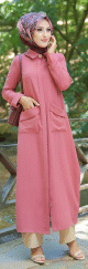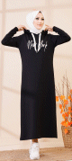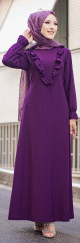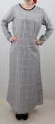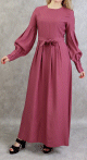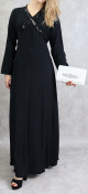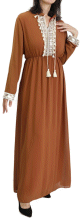 Très belle robe longue, entièrement doublée, col en V, ornée avec pompons et strass, taille élastiquée, manches longues poignets élastiques. Tissu de type mousseline.