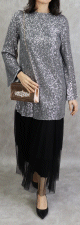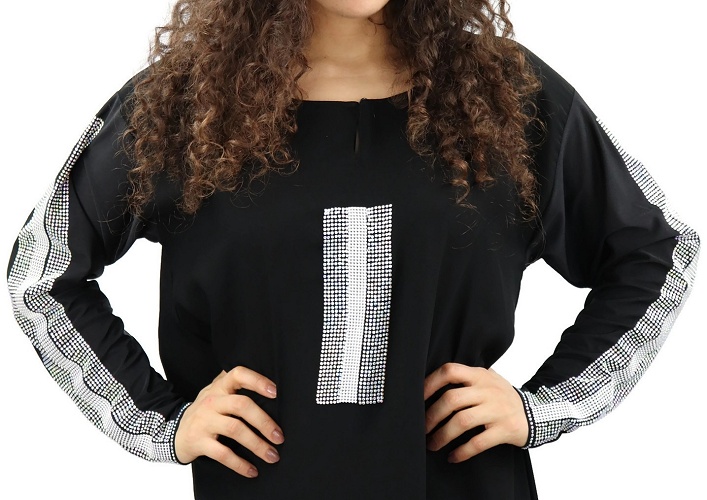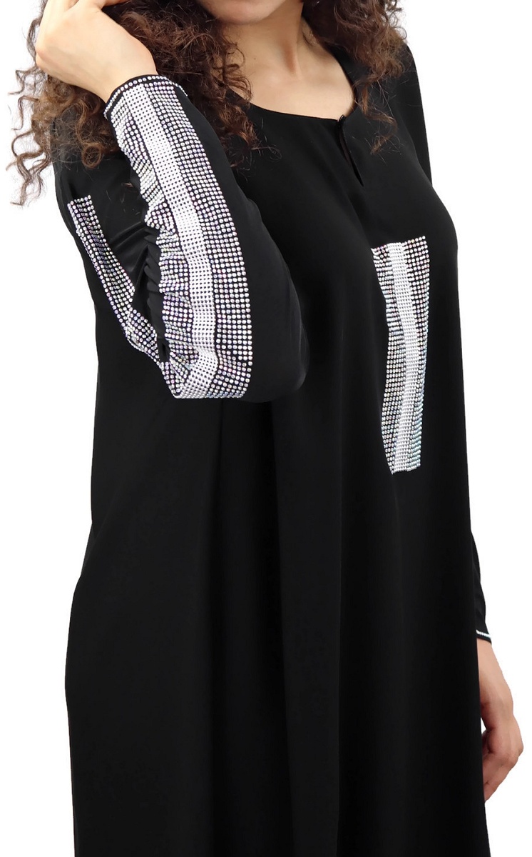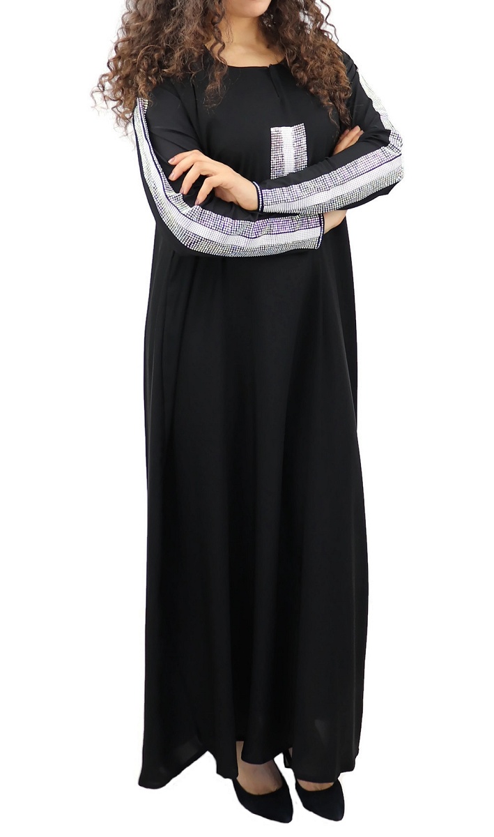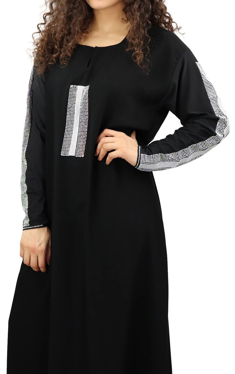 Jolie Abaya noire chic agrémentée de strass argentés sur le devant ainsi que sur toute la longueur des manches.
