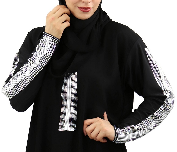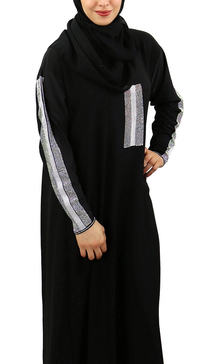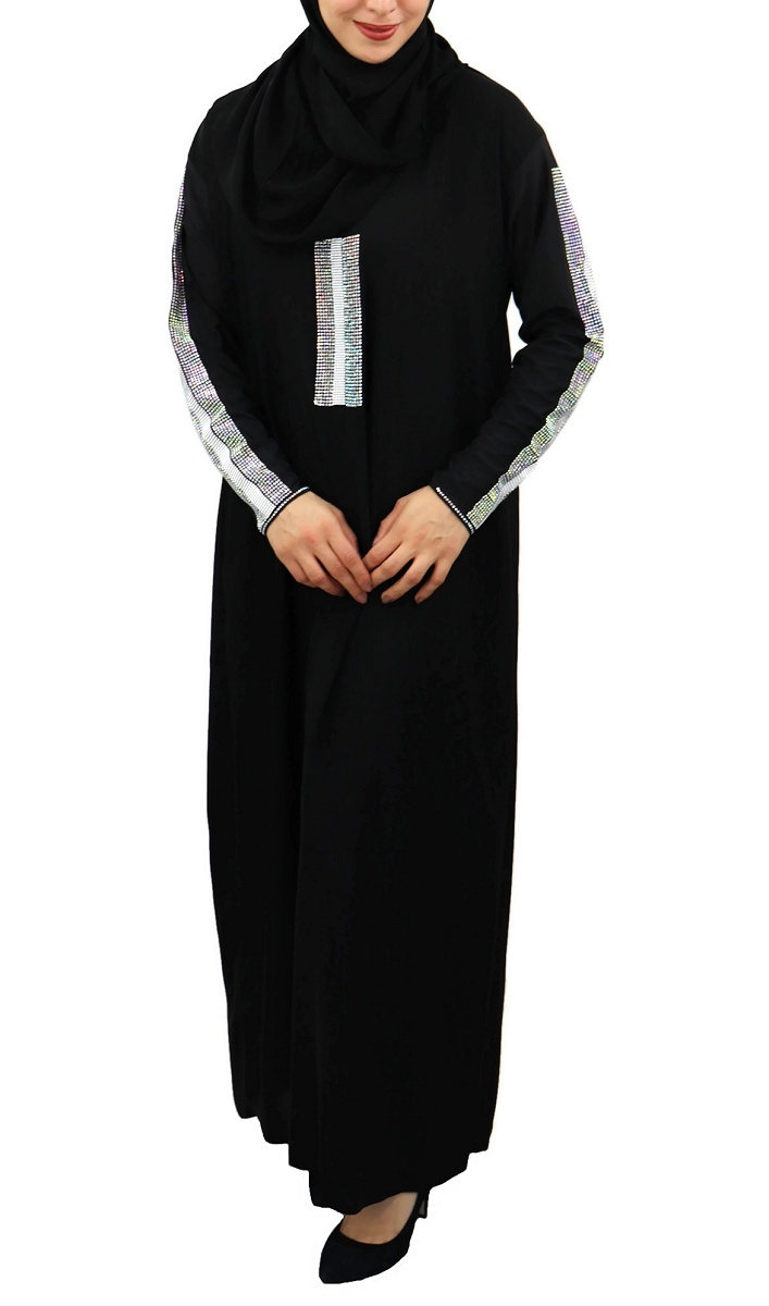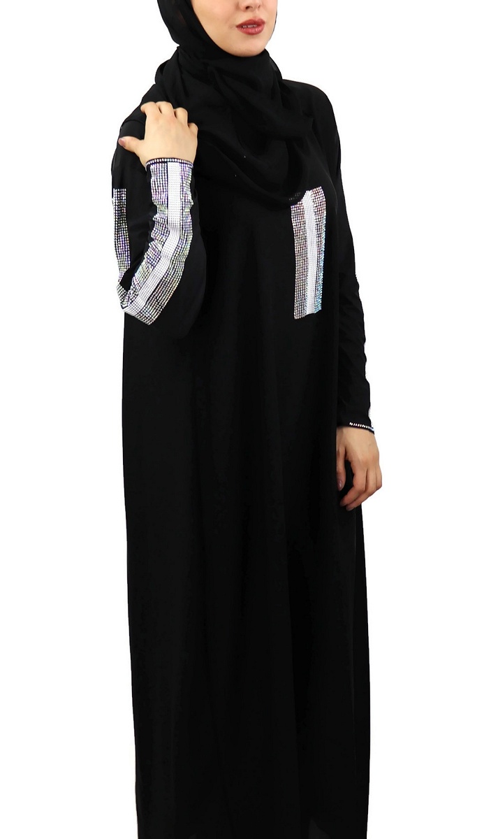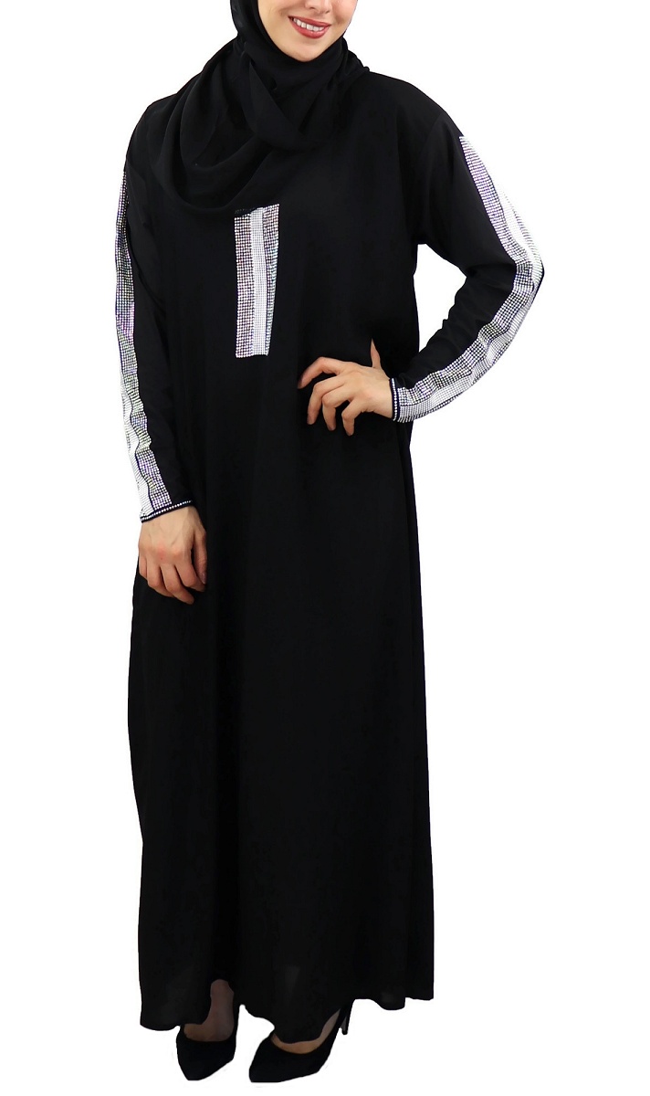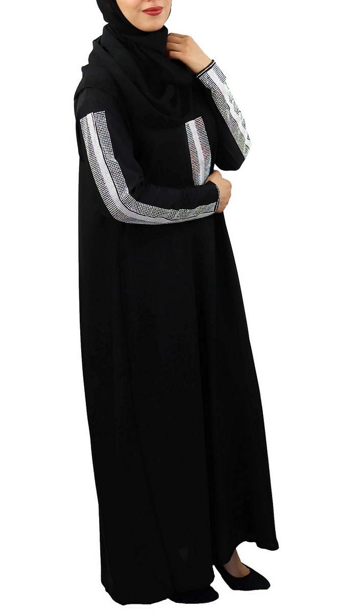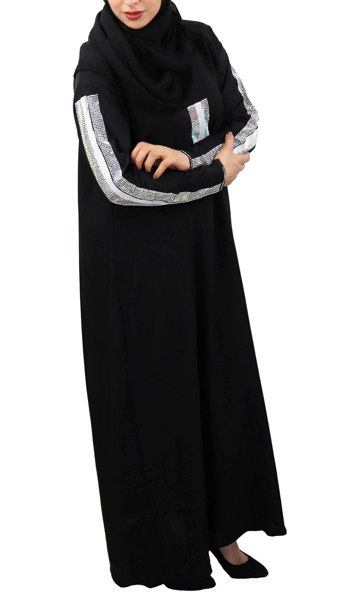 Jolie Abaya noire chic agrémentée de strass argentés sur le devant ainsi que sur toute la longueur des manches.