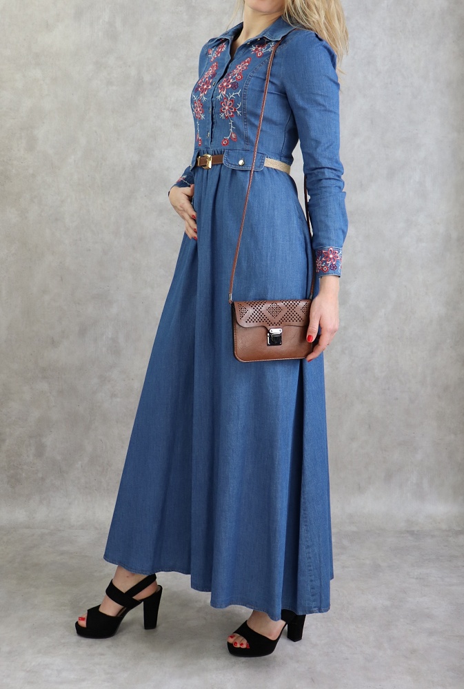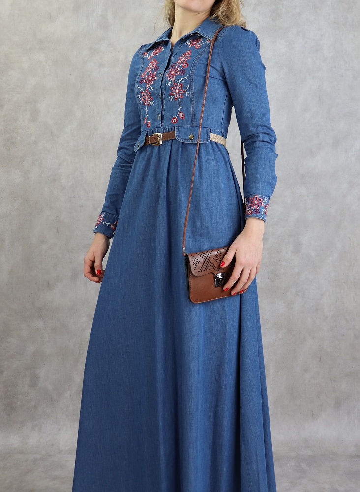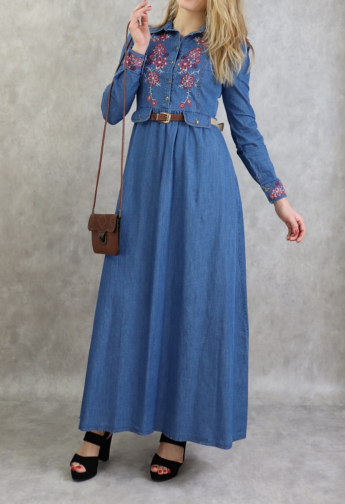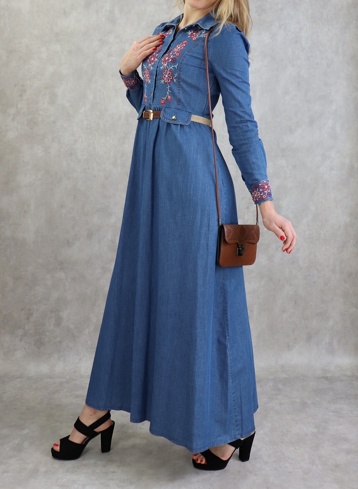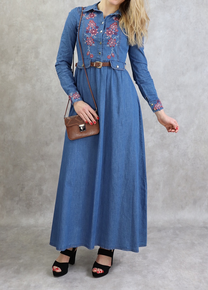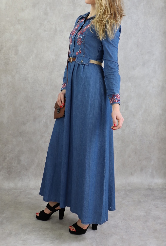 Robe longue, col chemise, fermeture boutons sur le buste, manches longues finition boutons aux poignets, taille cintrée, ceinture à passants. Coupe évasée vers le bas, tissu effet jean.