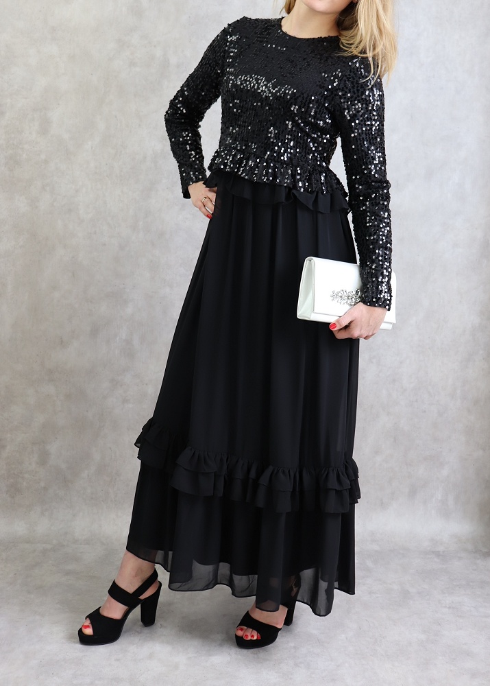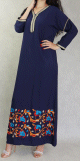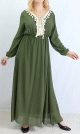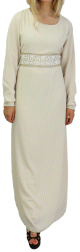 Robe longue, col rond, strass sur tout le buste et les manches, fermeture éclair au dos, taille cintrée, tulle doublée sur la moitié basse de la robe.