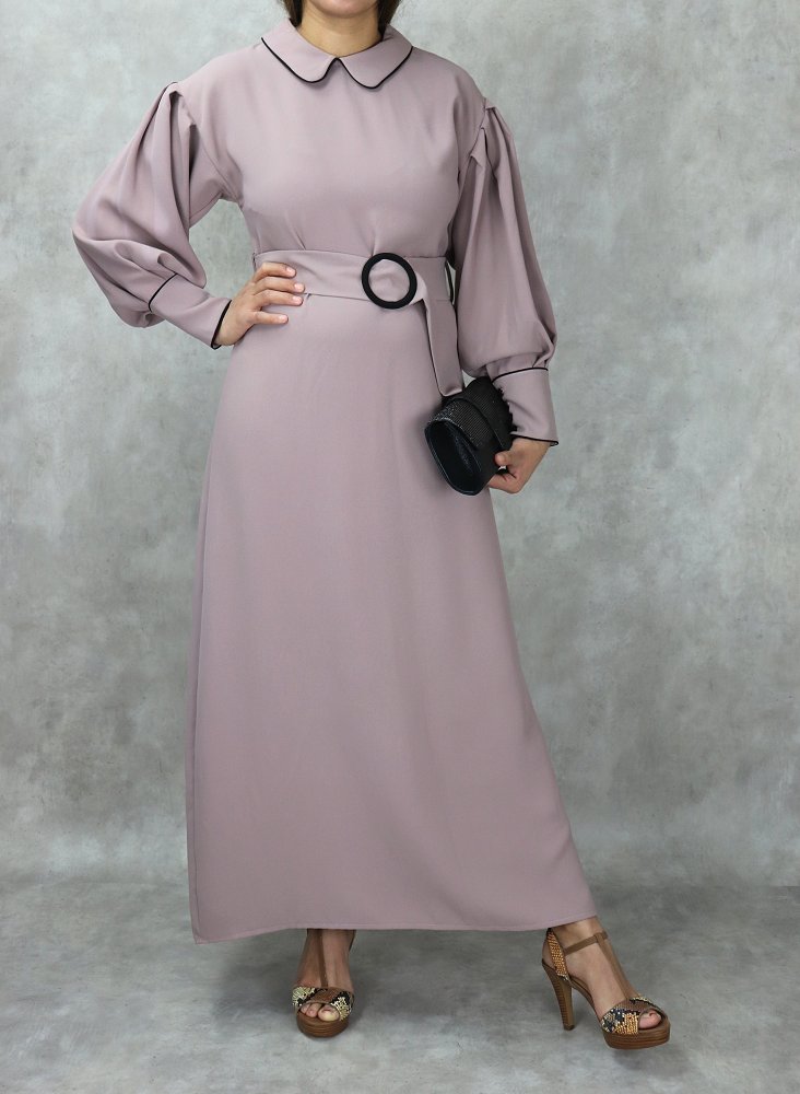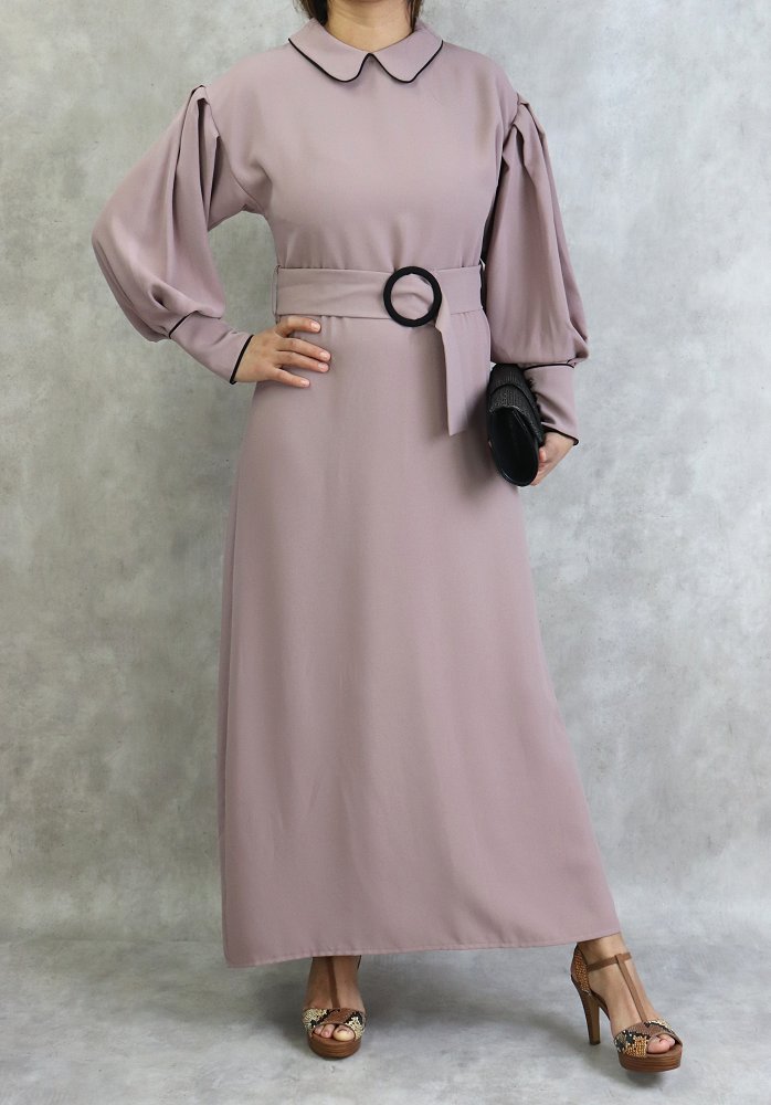Cette robe est parfaite. Réalisée dans un tissu fluide, col claudine, fermeture éclair au dos, manches longues bouffante, une fantaisie de boutons aux poignets, taille resserrée par une ceinture coulissante. Boucle effet écaille.