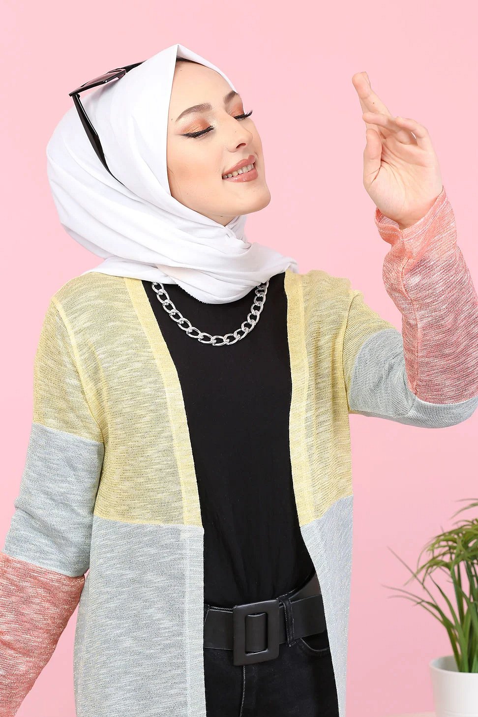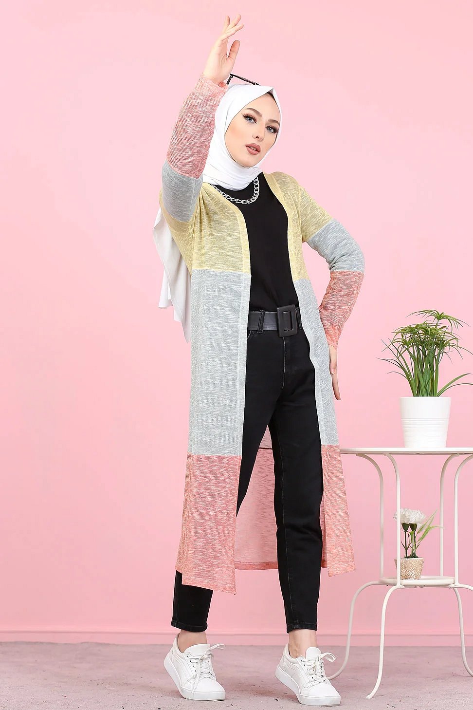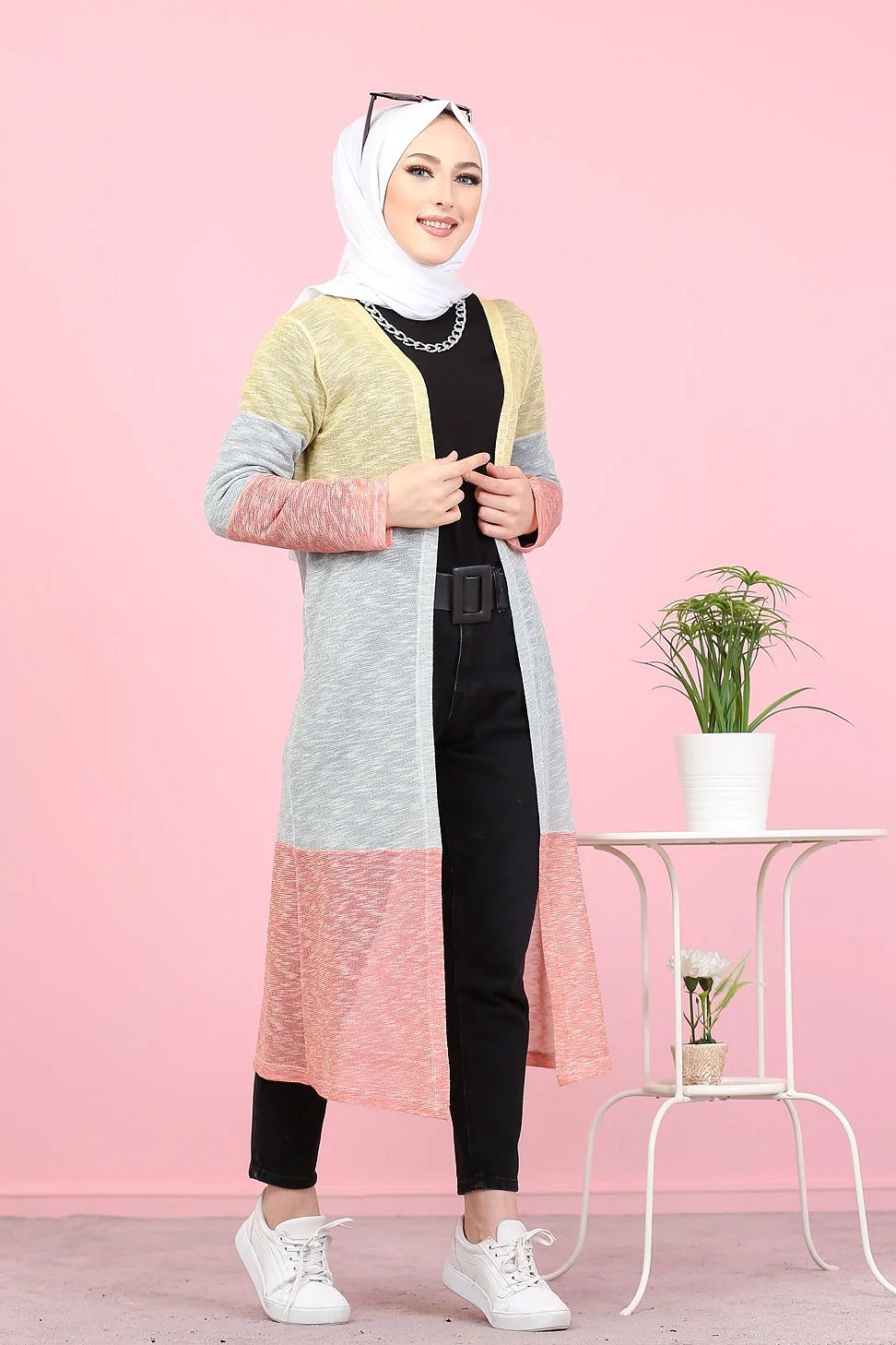 Cardigan Gilet long tricolore style décontracté moderne (Veste hijab moderne - Modest fashion France) - Couleur Jaune clair, vert pastel, corail Vetement & Accessoire