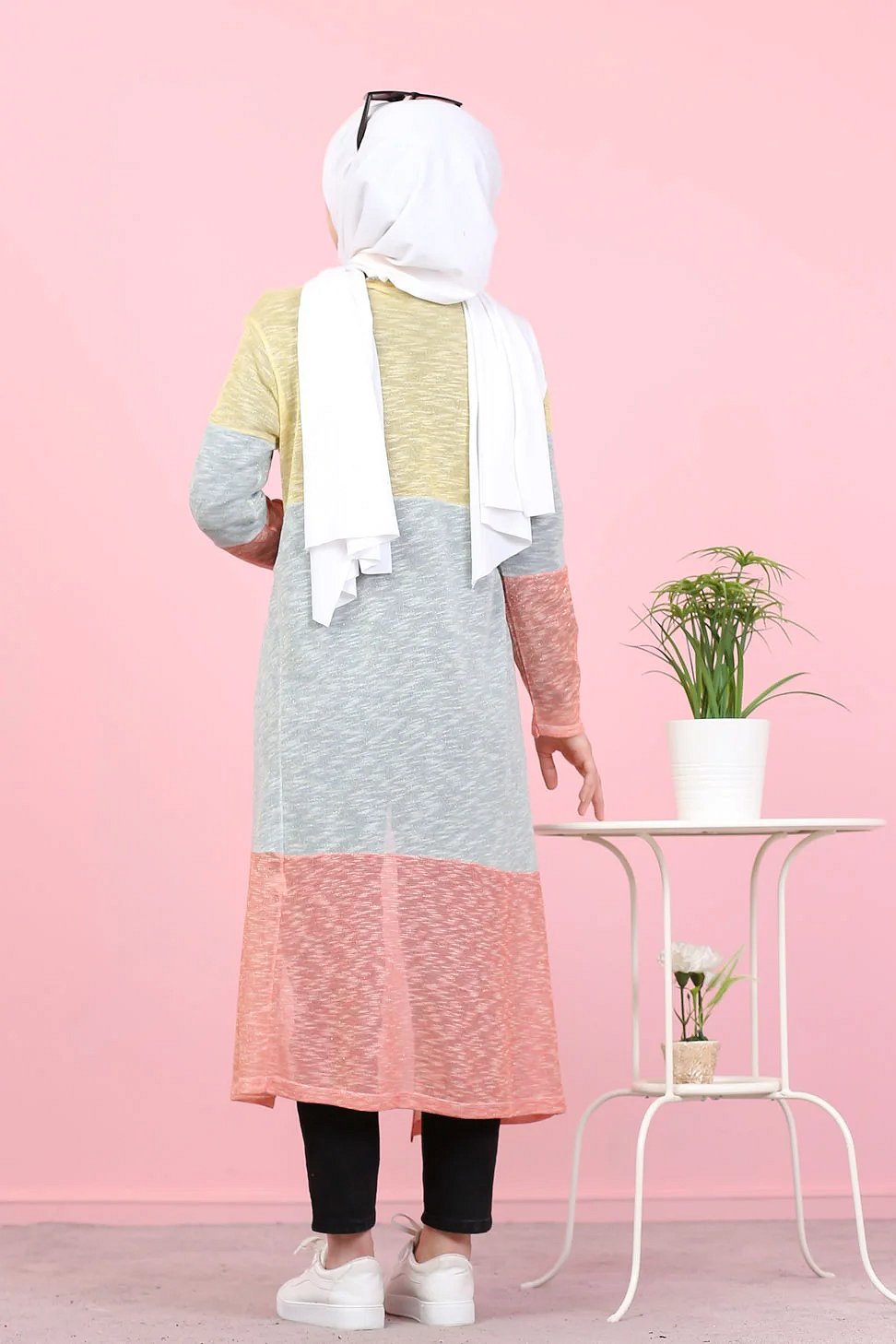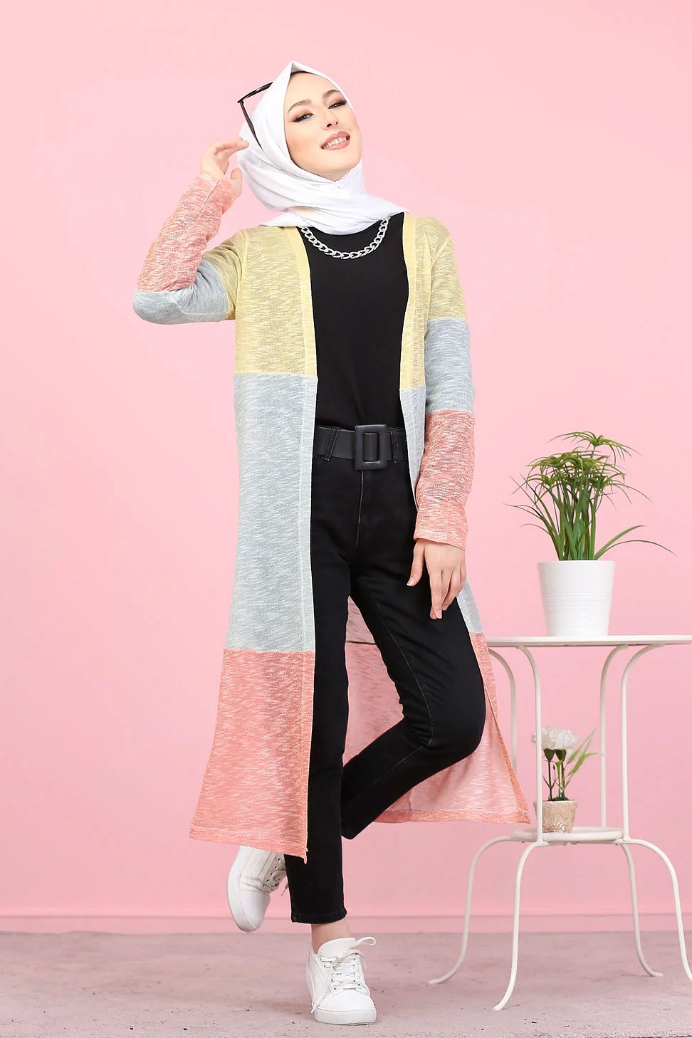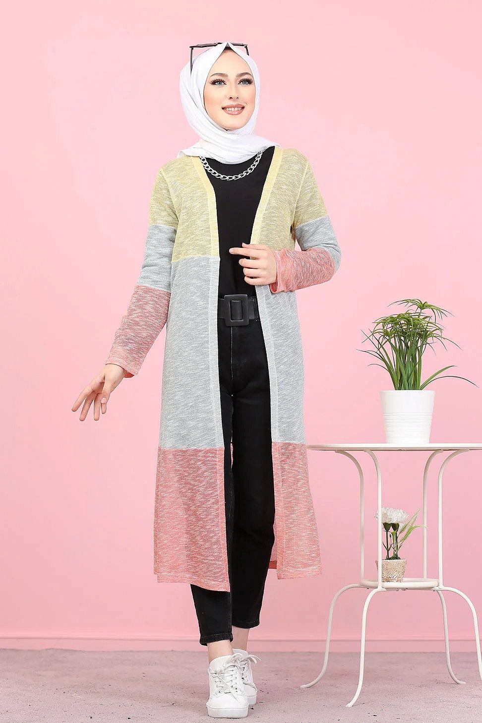 Cardigan Gilet long tricolore style décontracté moderne (Veste hijab moderne - Modest fashion France) - Couleur Jaune clair, vert pastel, corail Vetement & Accessoire