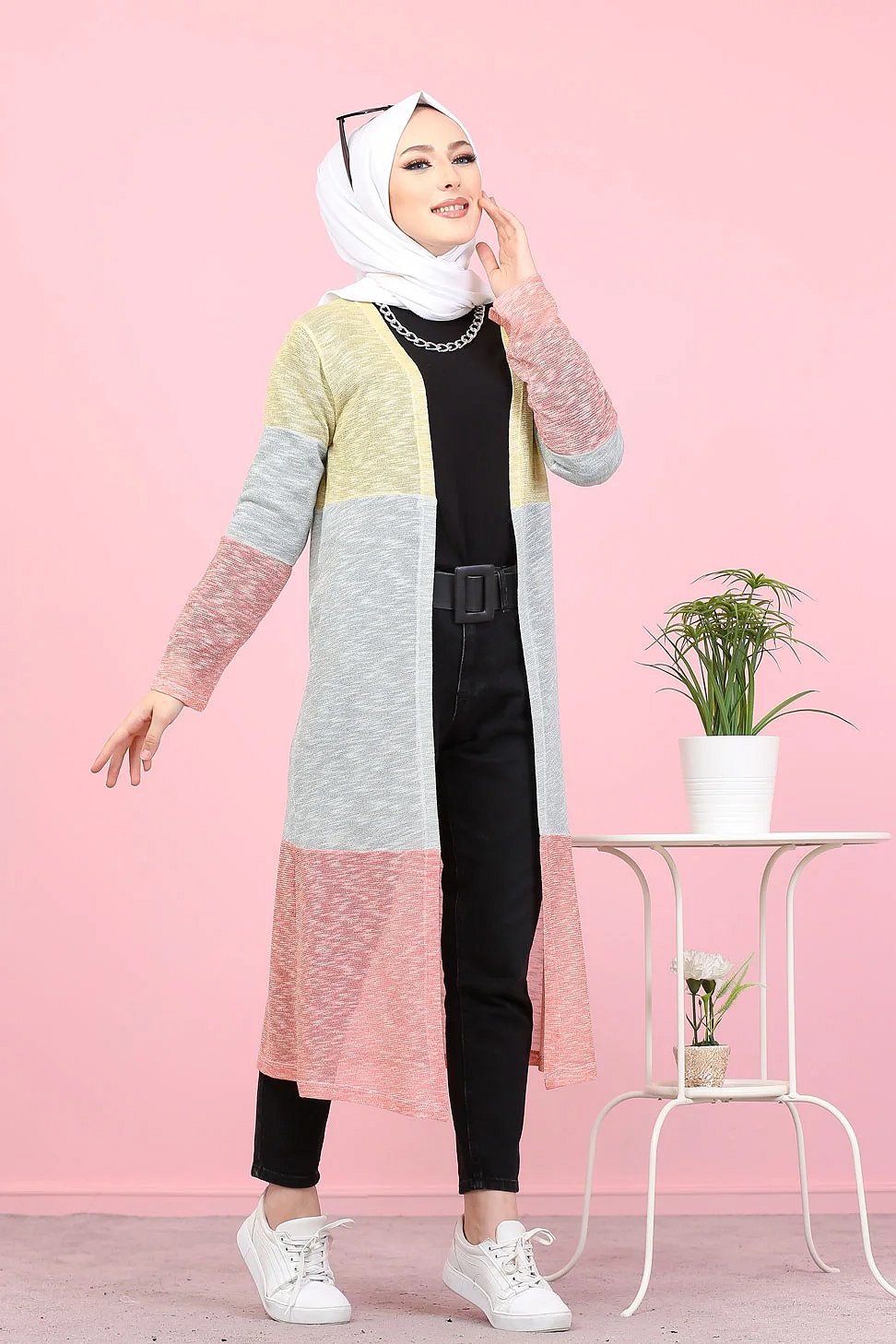 Cardigan Gilet long tricolore style decontracte moderne (Veste hijab moderne - Modest fashion France) - Couleur Jaune clair, vert pastel, corail