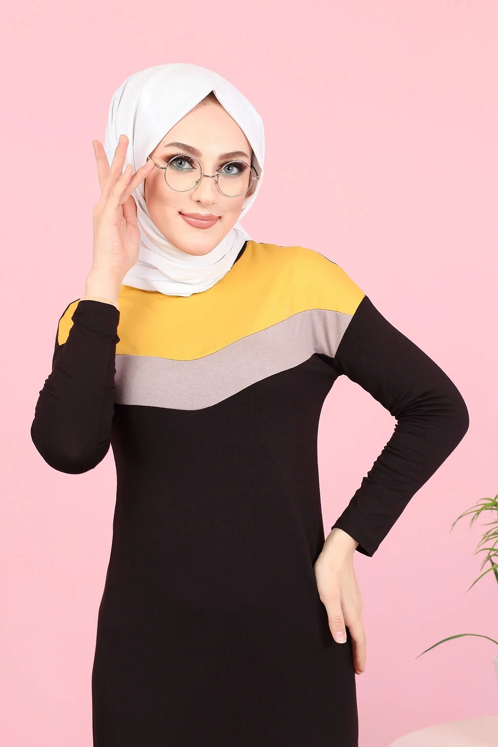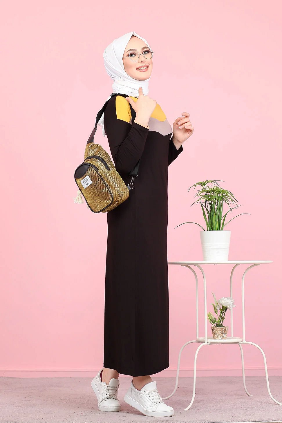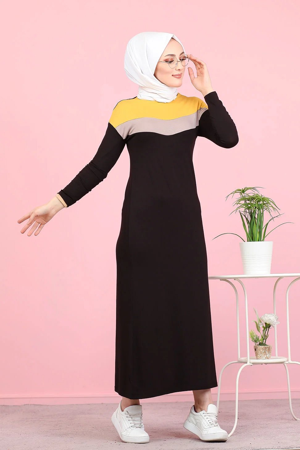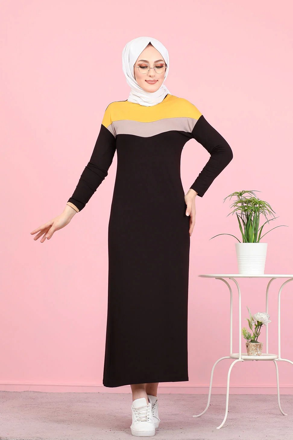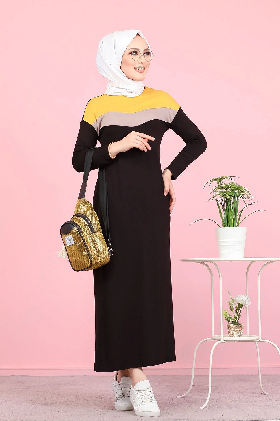 Robe longue tricolore pour femme musulmane (Vetement Hijab Tofisa France) - Couleur noir, moutarde et beige