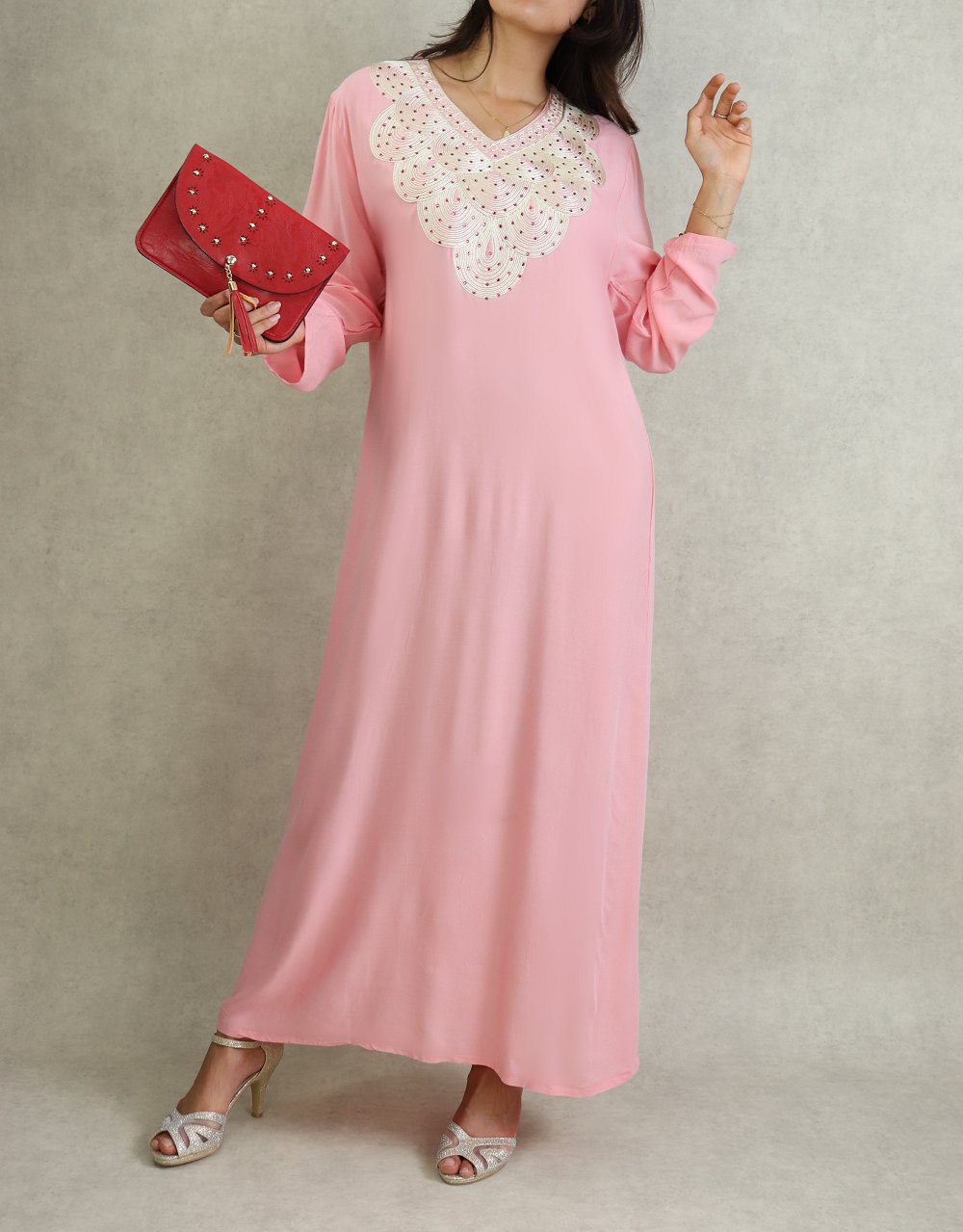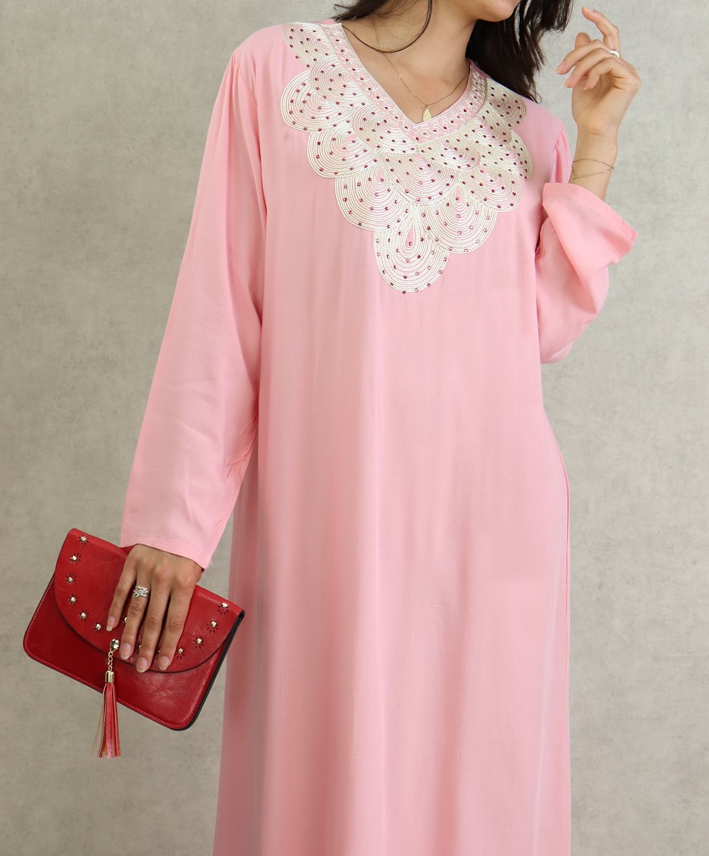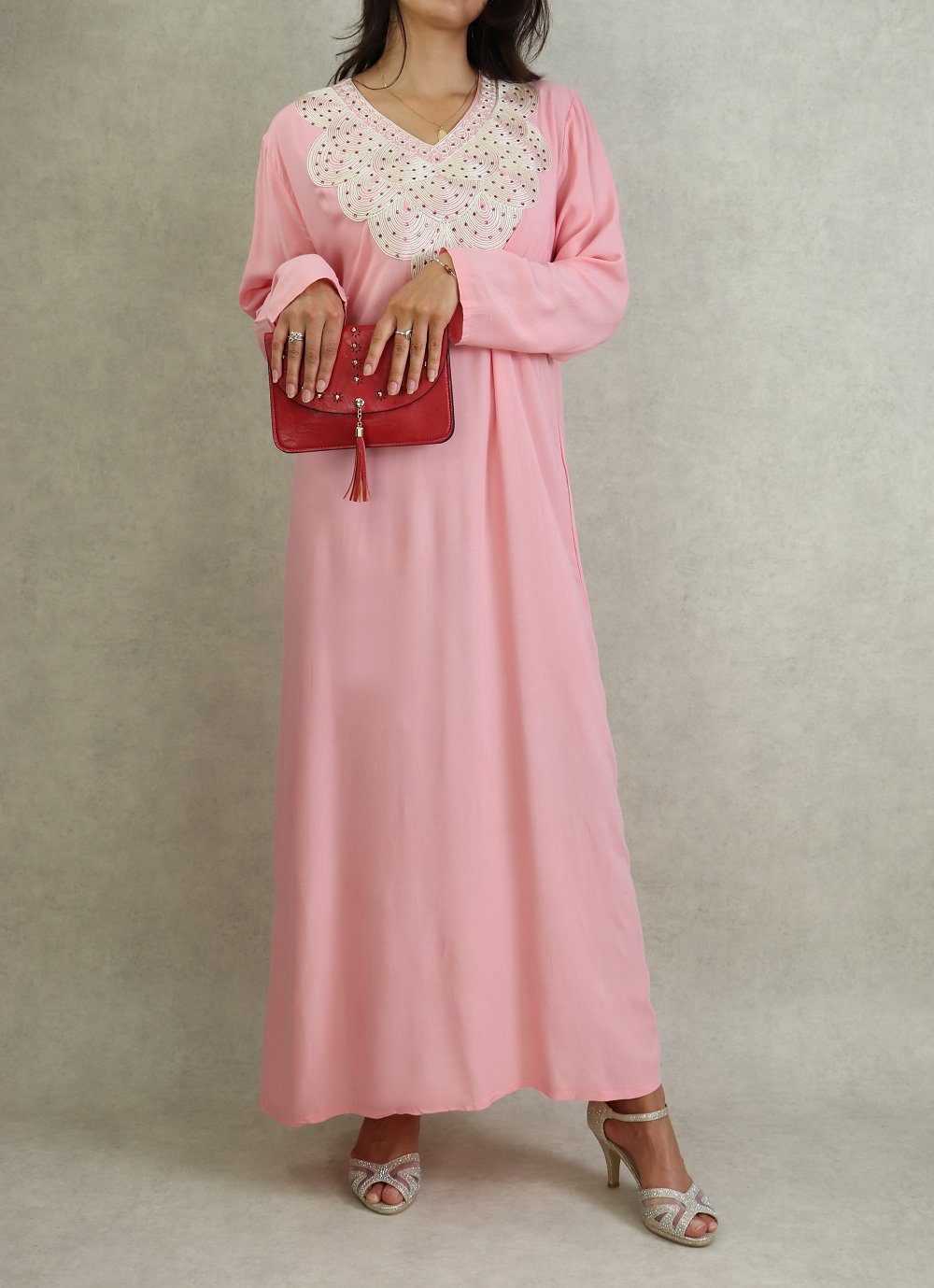 Robe orientale longue avec broderies - Manches longues - Couleur Rose Poudrée Vetement & Accessoire