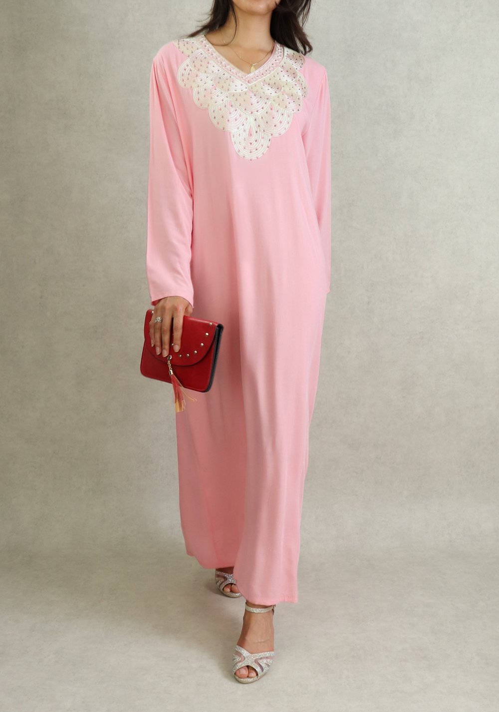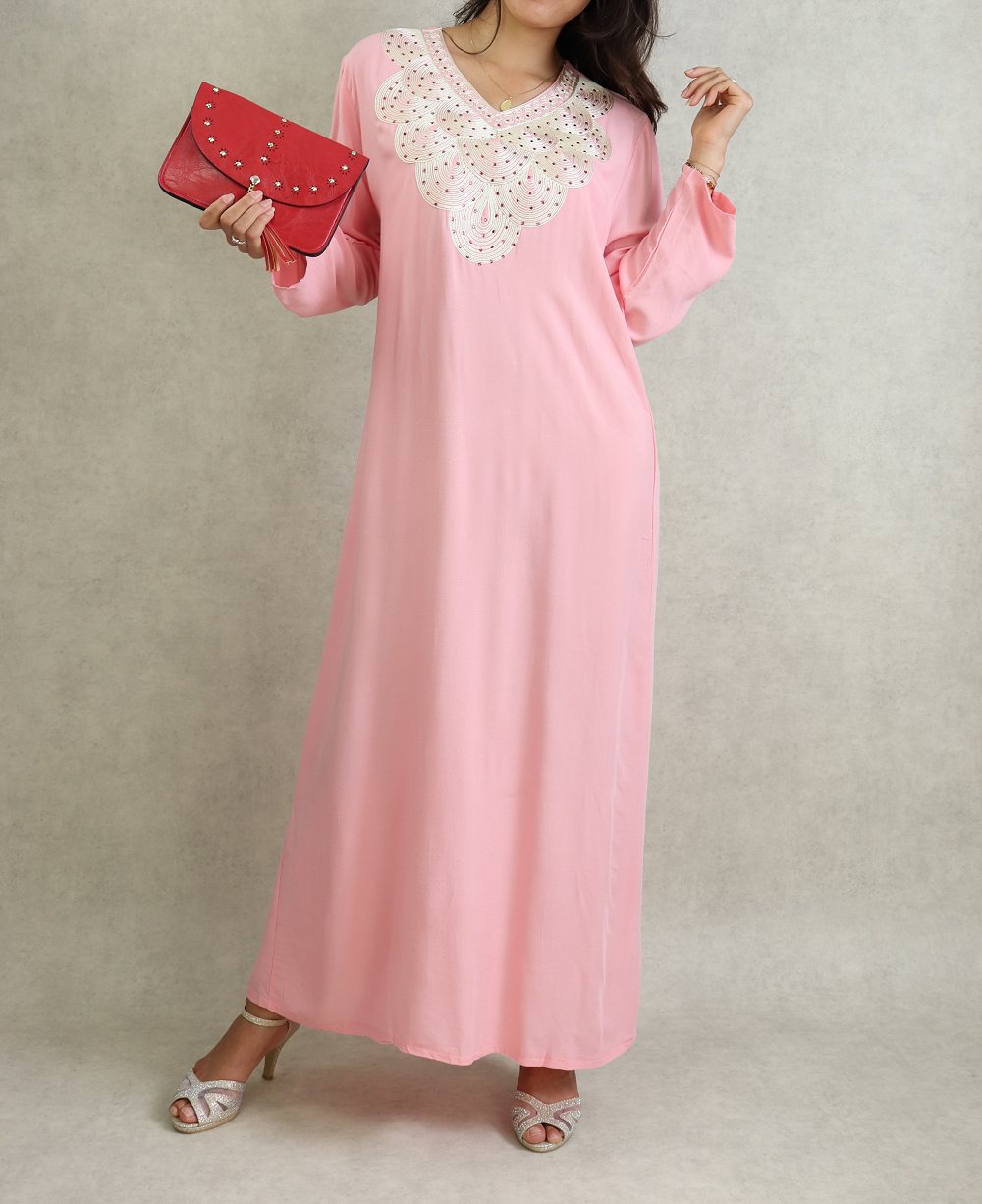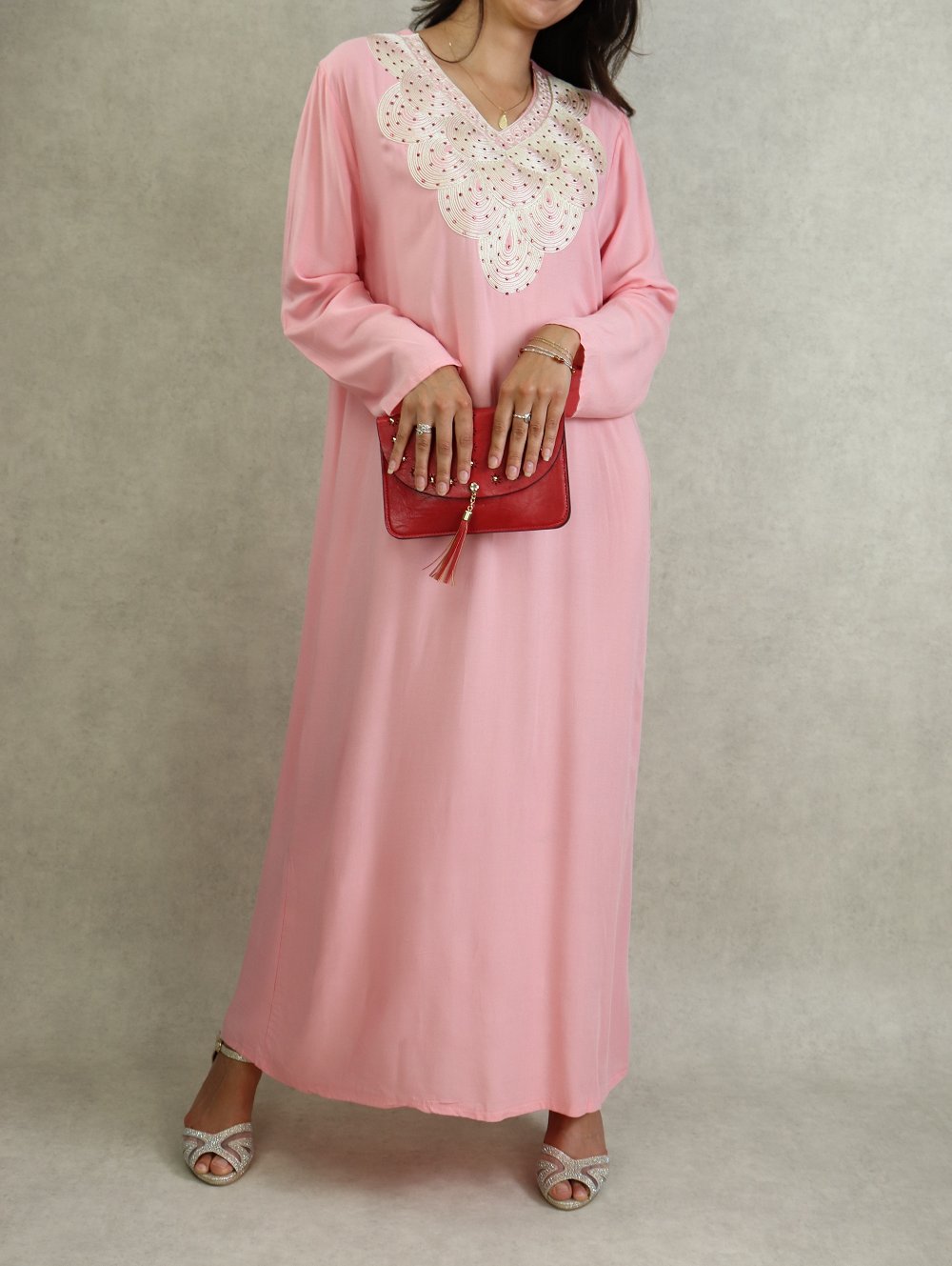 Robe orientale longue avec broderies - Manches longues - Couleur Rose Poudrée Vetement & Accessoire