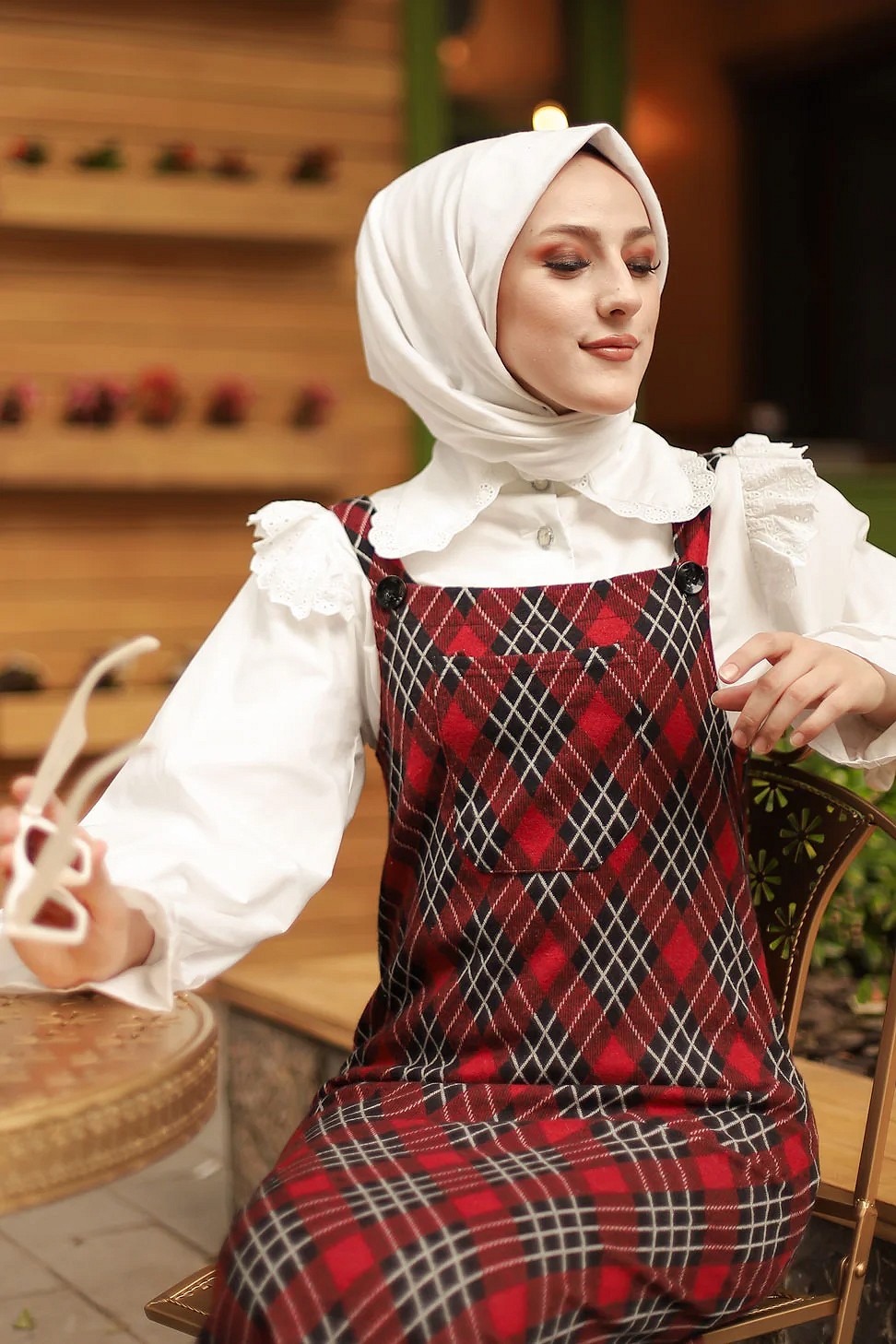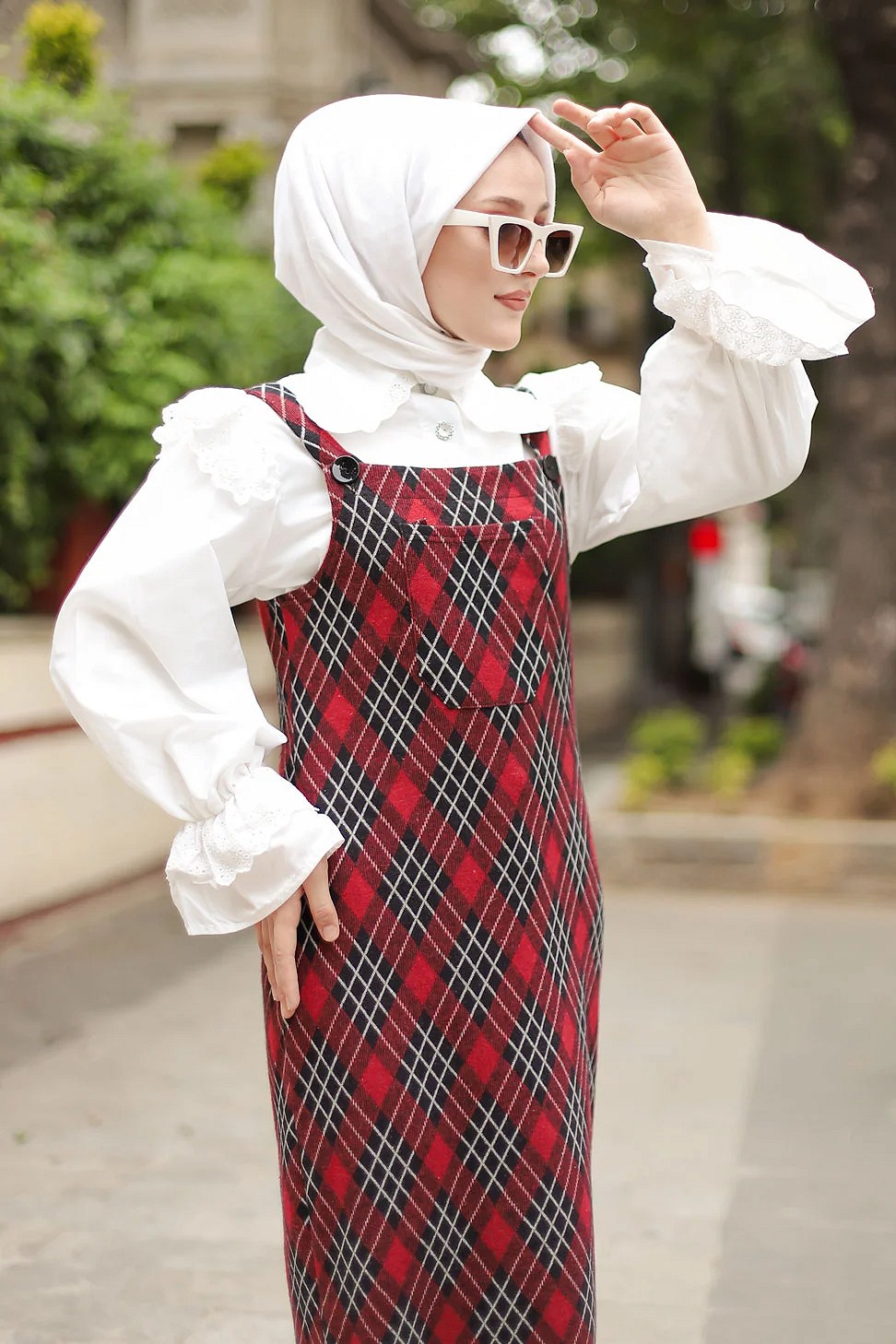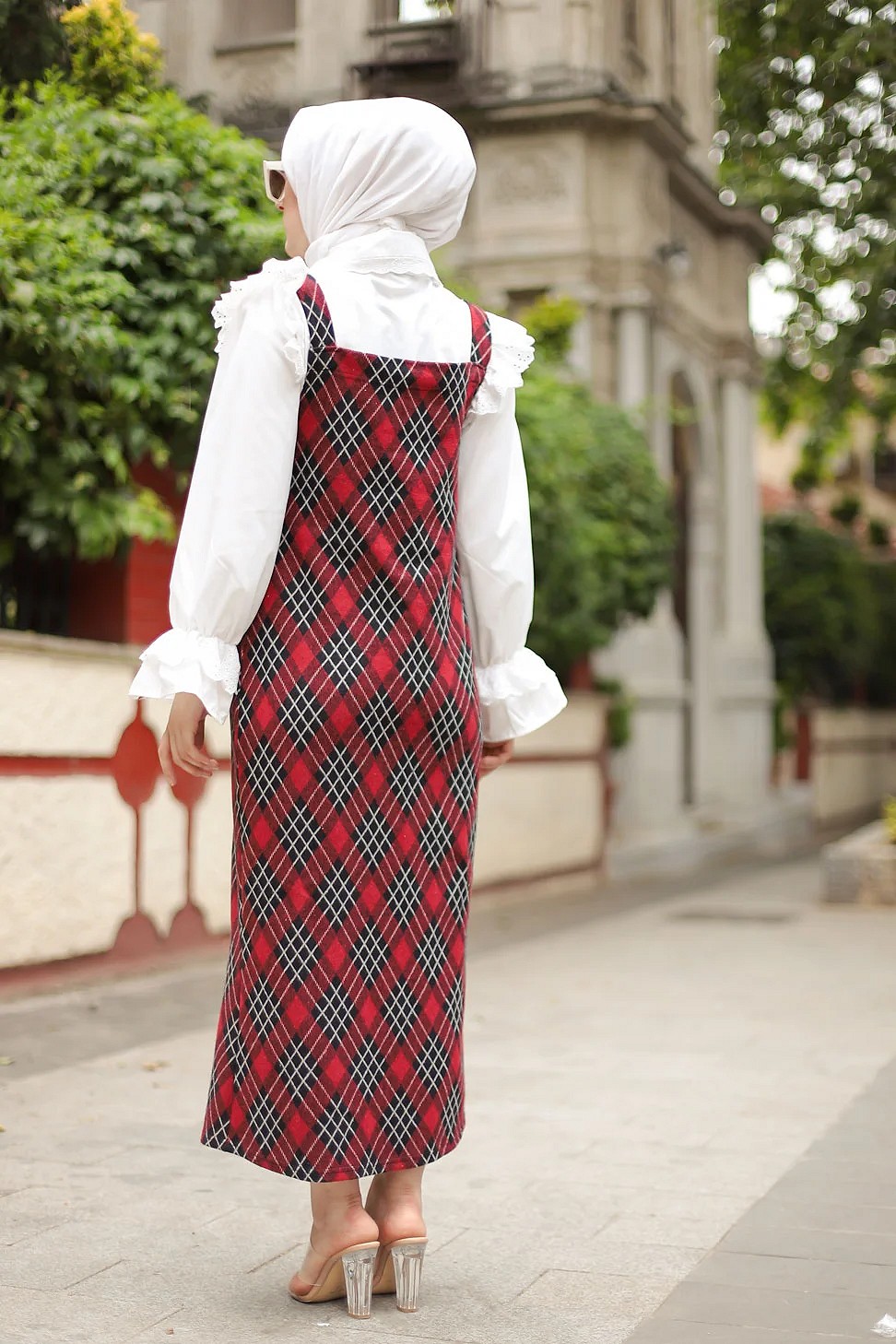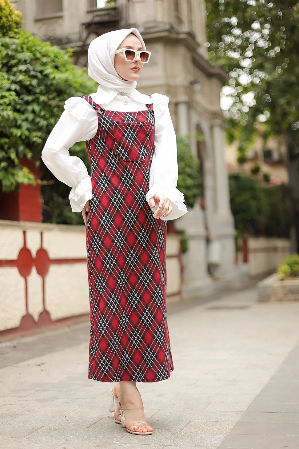Robe Salopette femme à carreaux (Vente en ligne Prêt à porter femme musulmane) - Couleur gris et rouge Vetement & Accessoire