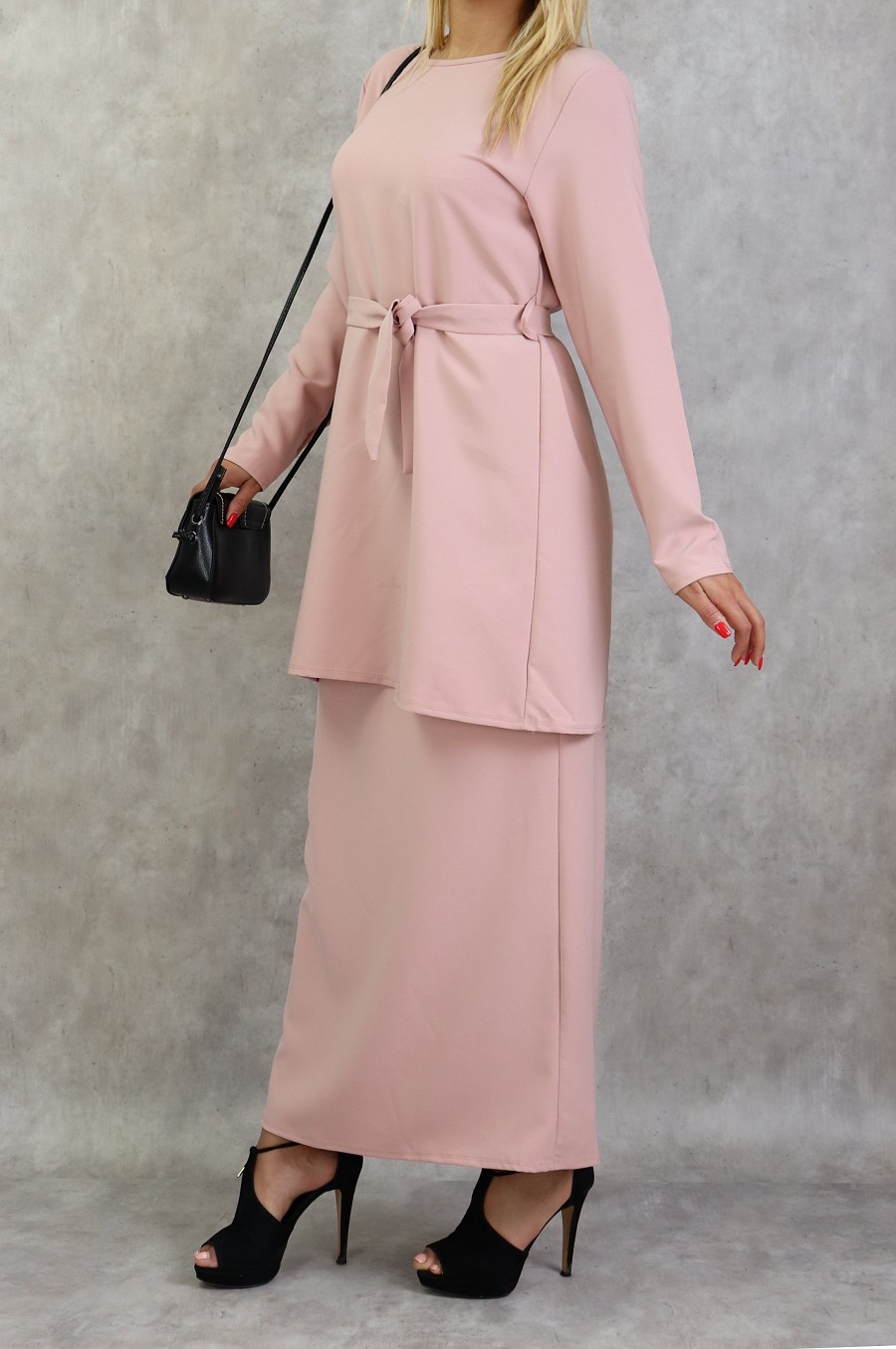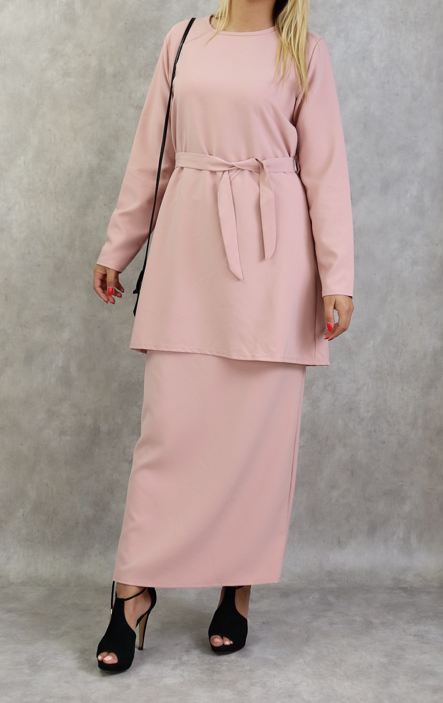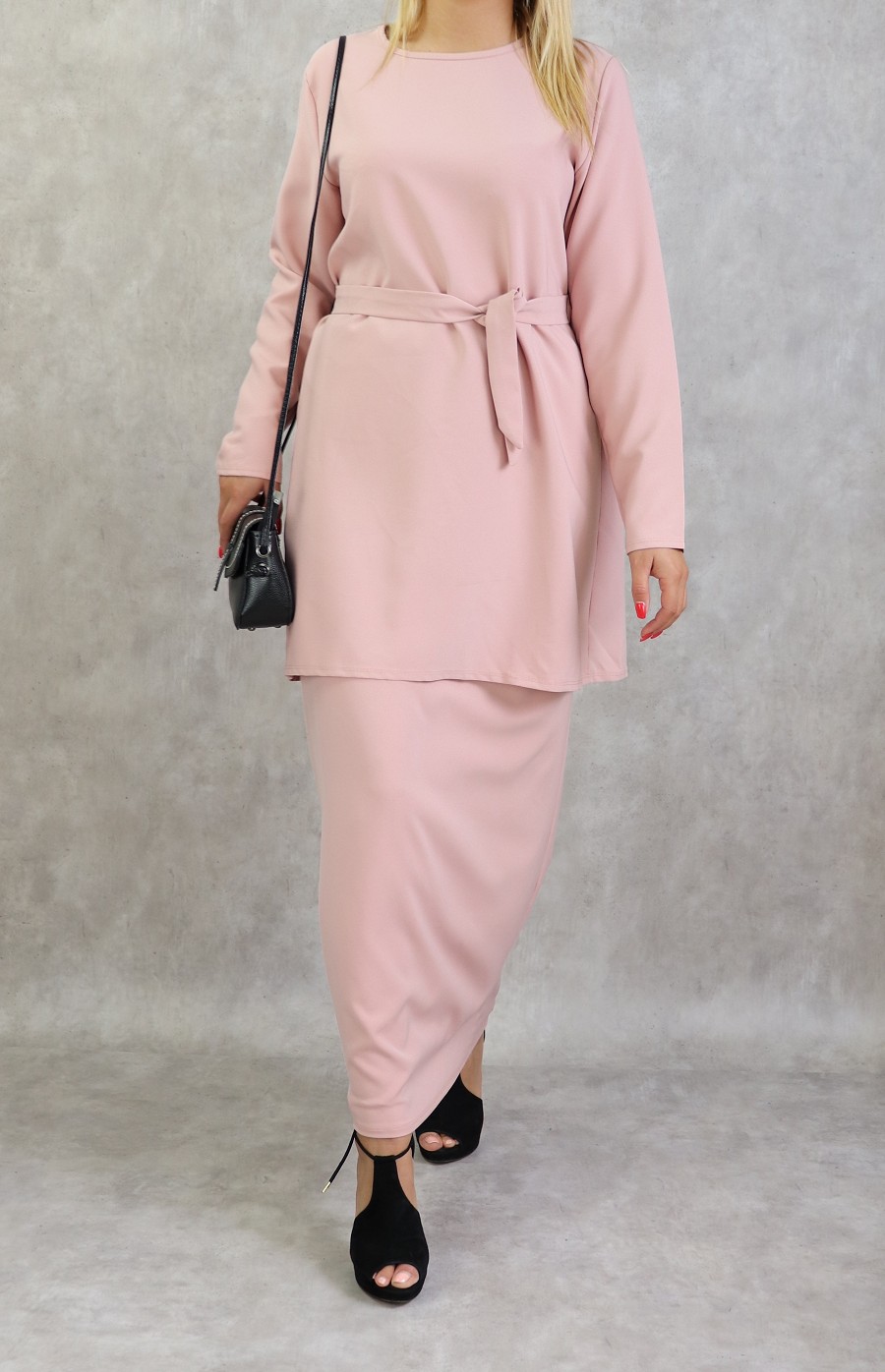 Très bel ensemble sobre et éléguant. Jupe droite longueur 100 cm, taille élastique. Longueur de la tunique 83 cm avec sa ceinture assortie.