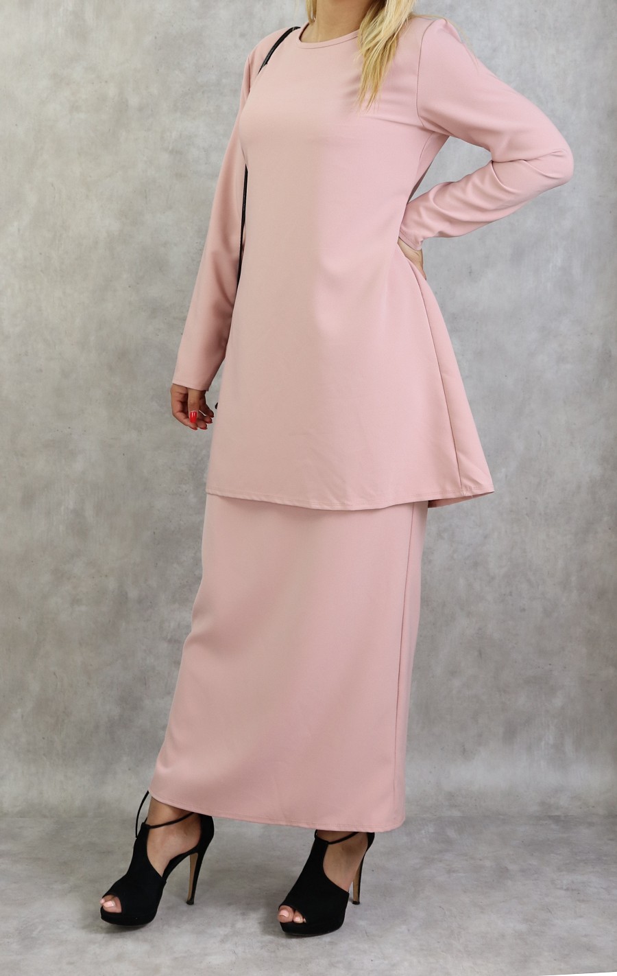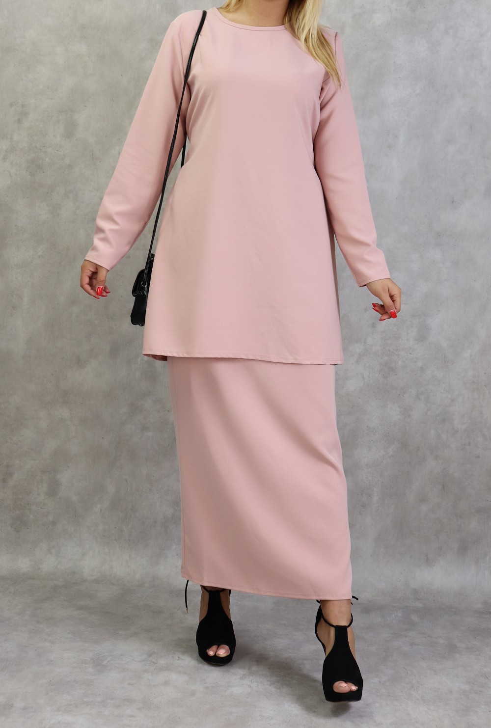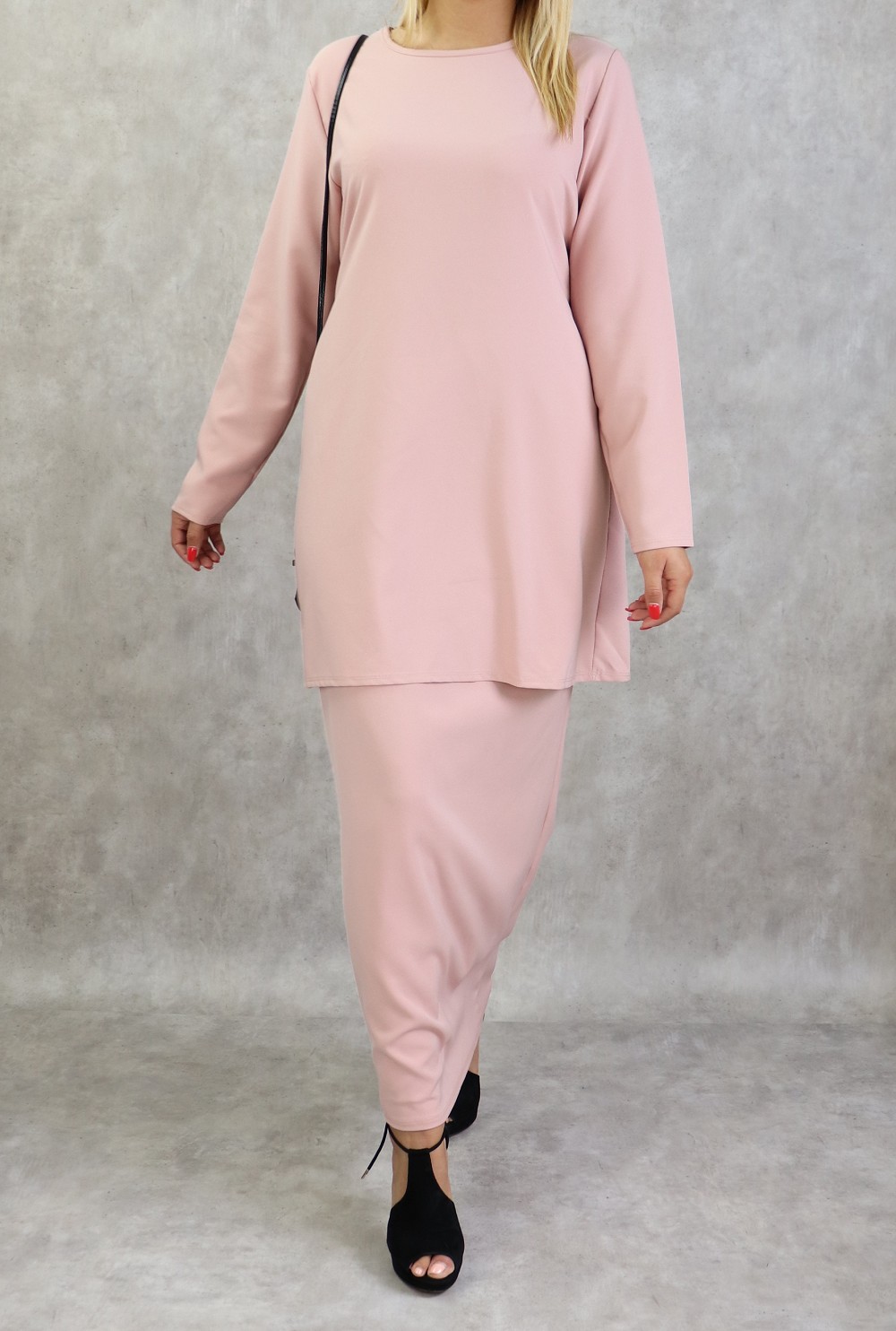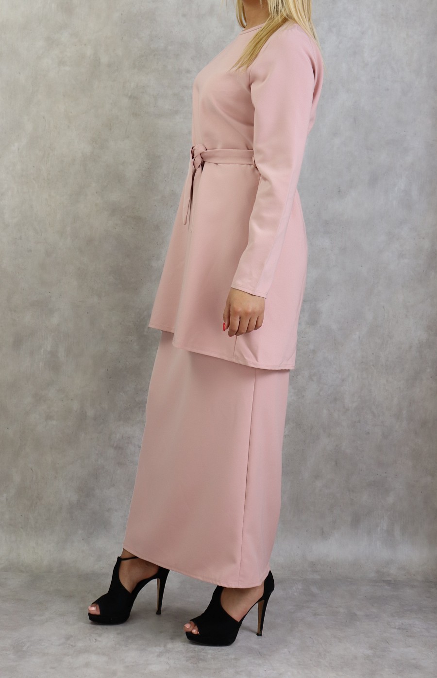Très bel ensemble sobre et éléguant. Jupe droite longueur 100 cm, taille élastique. Longueur de la tunique 83 cm avec sa ceinture assortie.