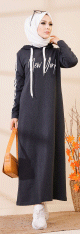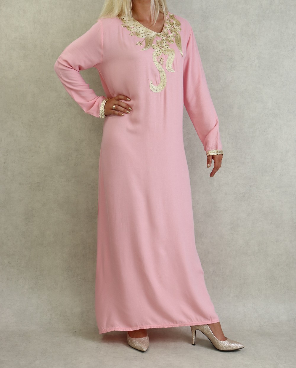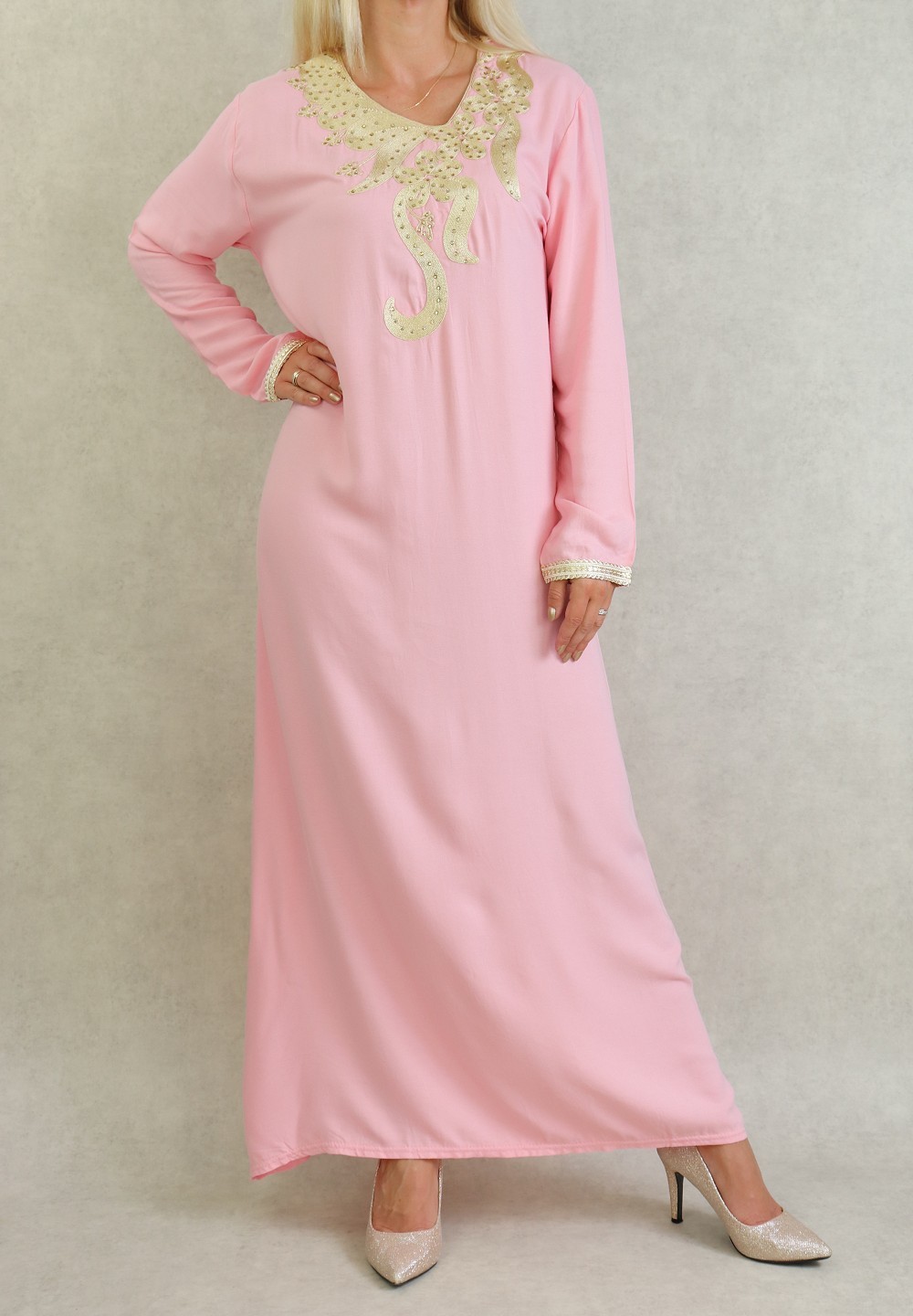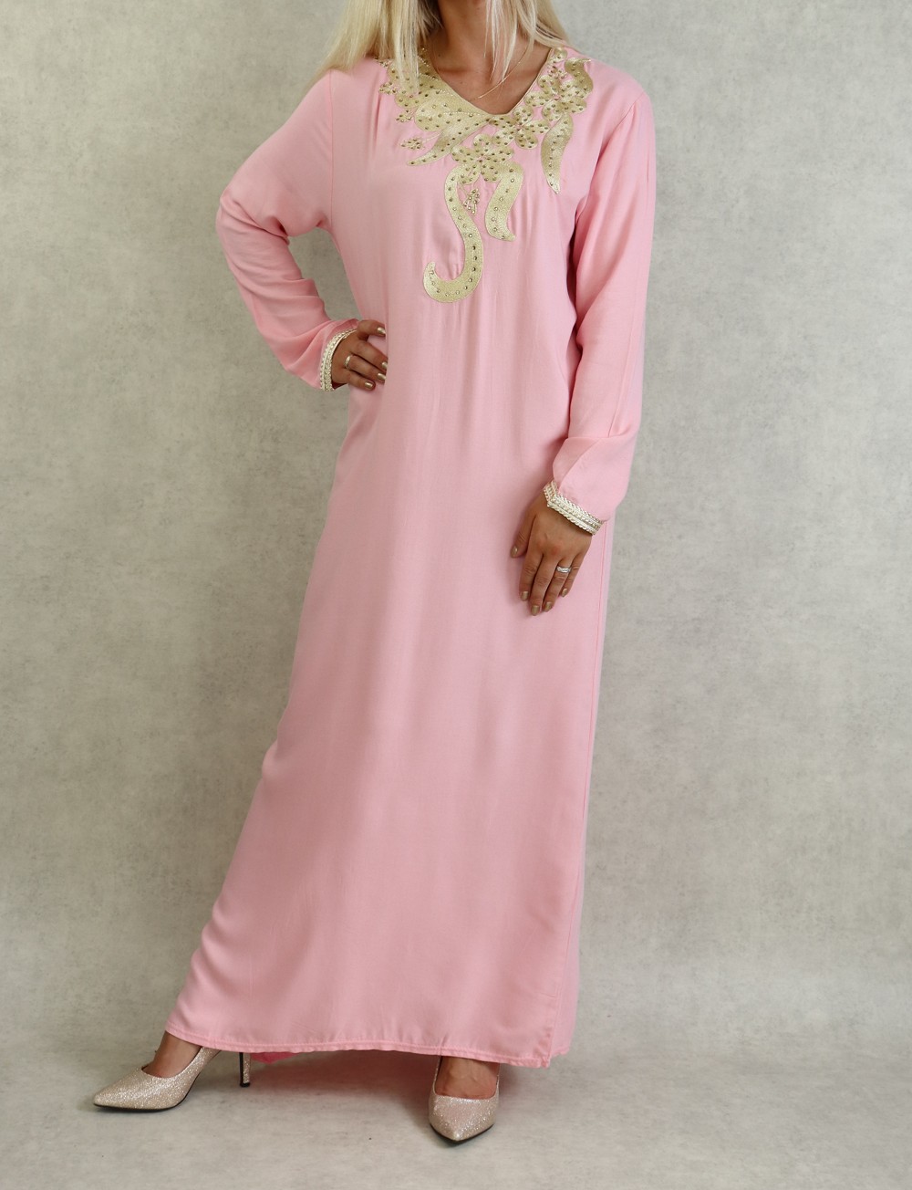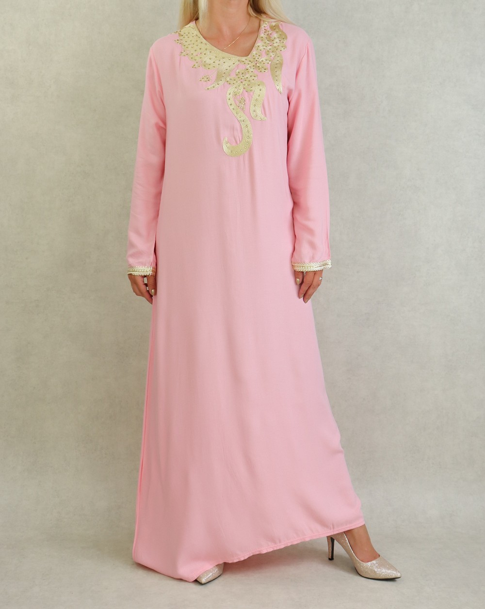 Robe longue, col dégagé, manches longues, broderies et strass dorés sur le devant. Coupe droite, tissu doux et fluide de type coton.