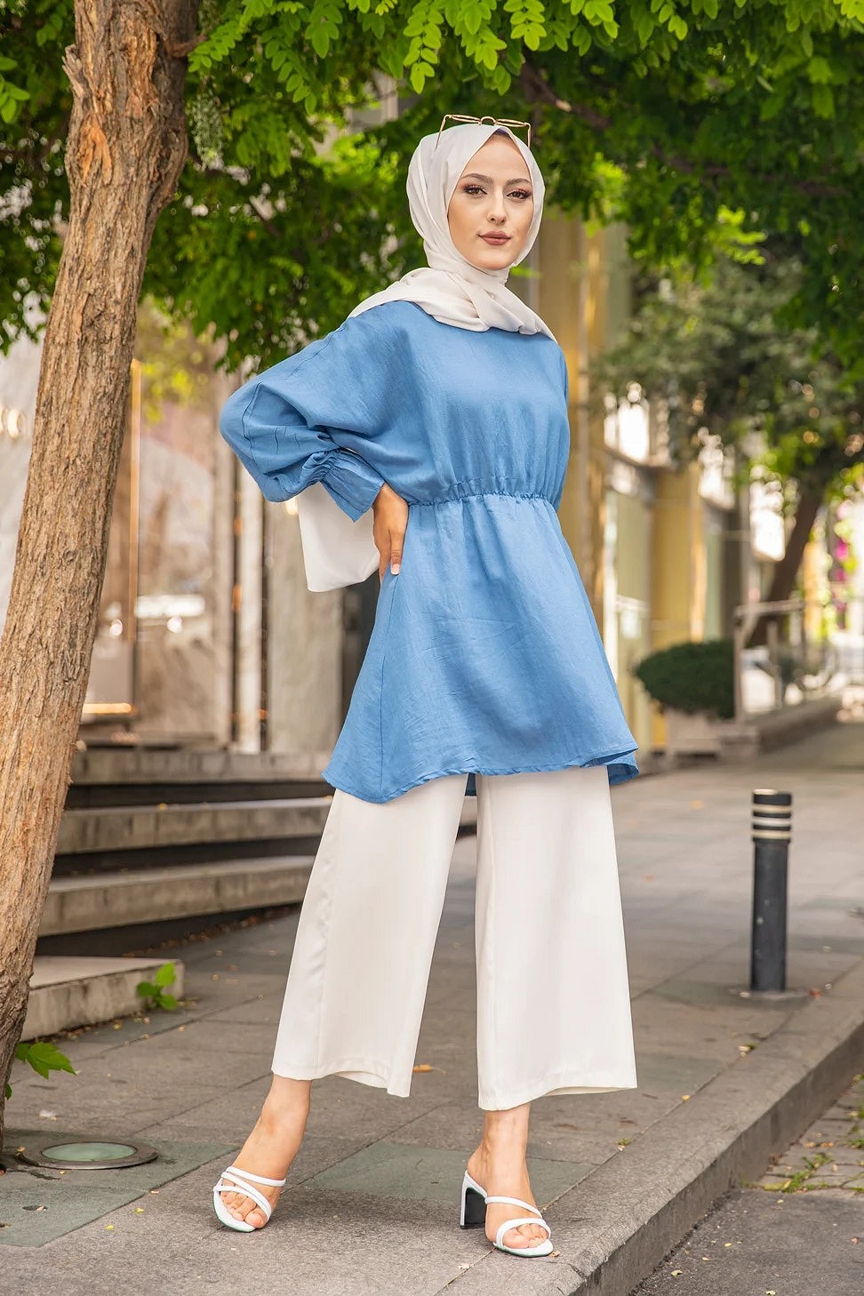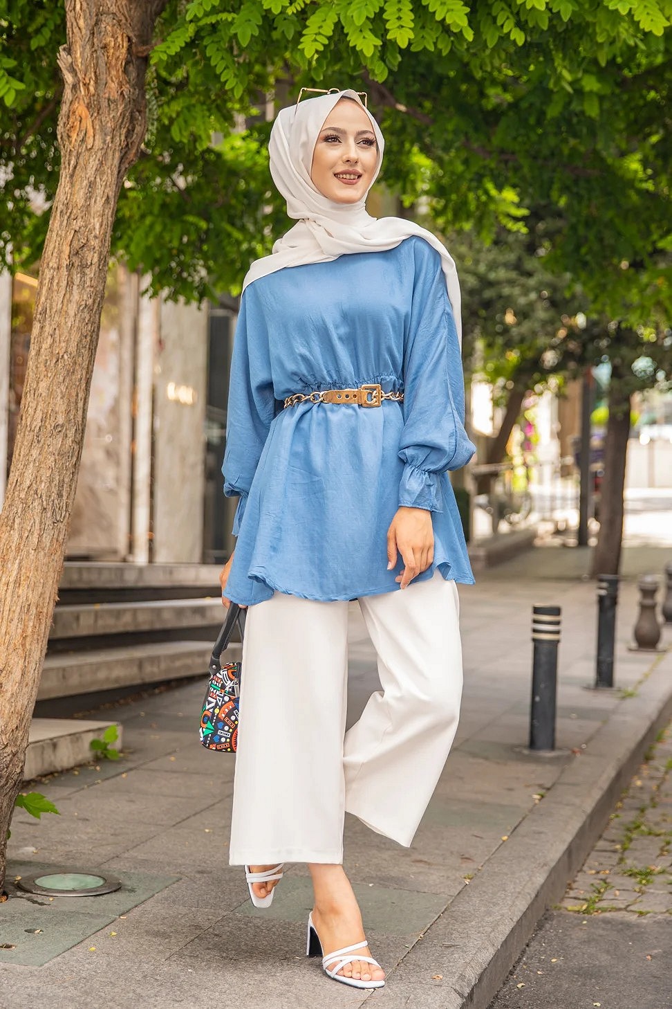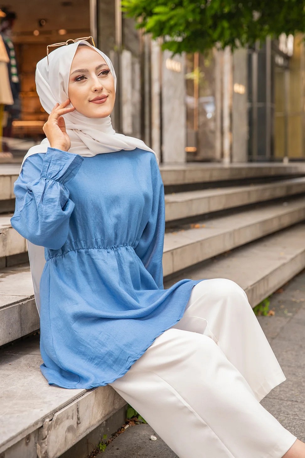 Chemise-Tunique motif fleur (Vêtement pour femme voilée) - Couleur des rayures : bleu ciel - REF. 35929 (24.90 €) - En Promotion à 19.90 €