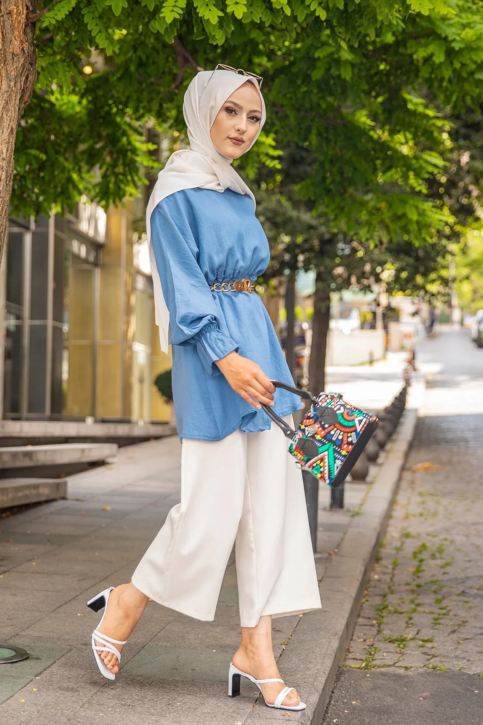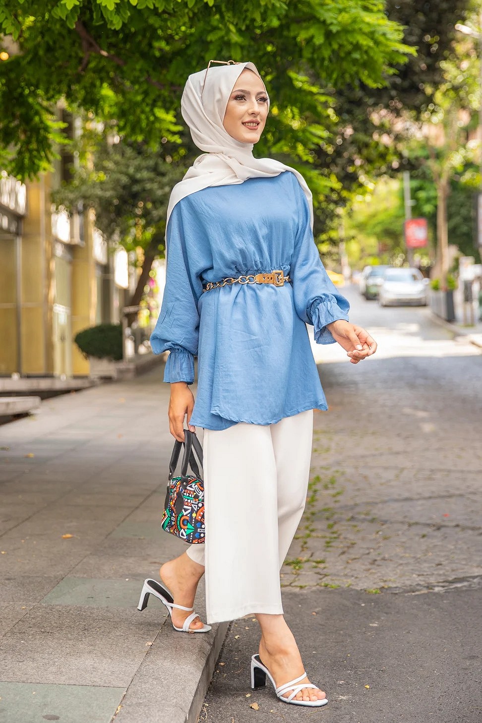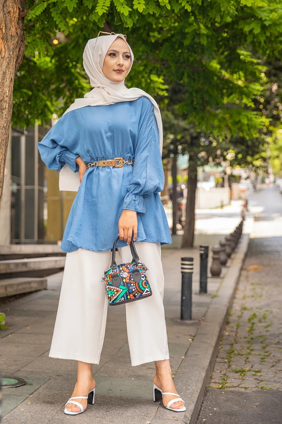 Chemise-Tunique motif fleur (Vêtement pour femme voilée) - Couleur des rayures : bleu ciel - REF. 35929 (24.90 €) - En Promotion à 19.90 €