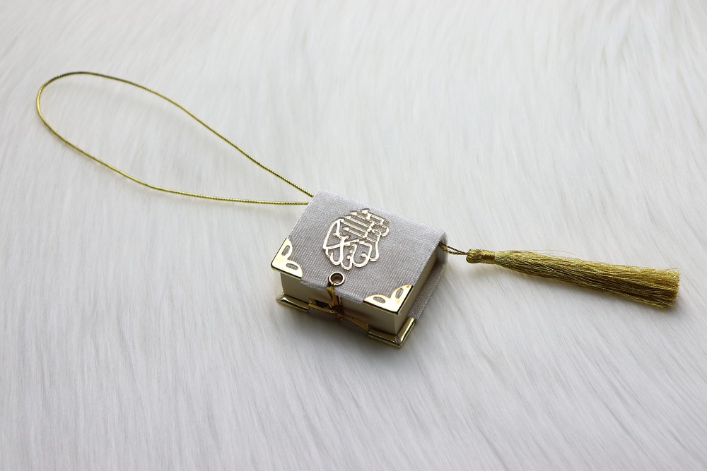 Pendentif Mini-Coran recouvert de velours avec parties dorées (Décoration islamique) - Couleur beige or - REF. 34496 (4.90 €)