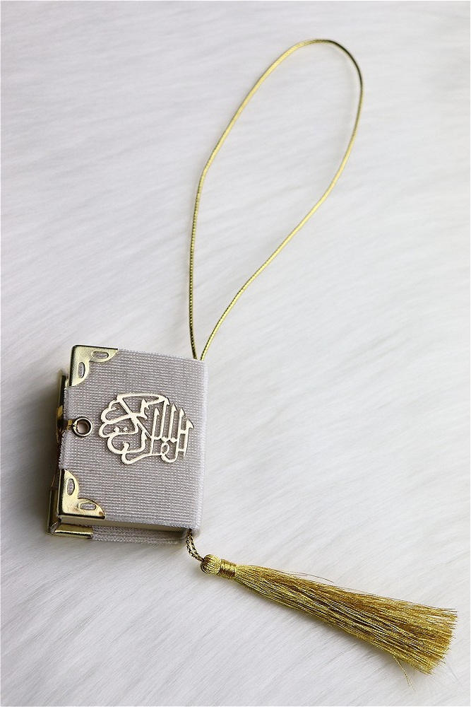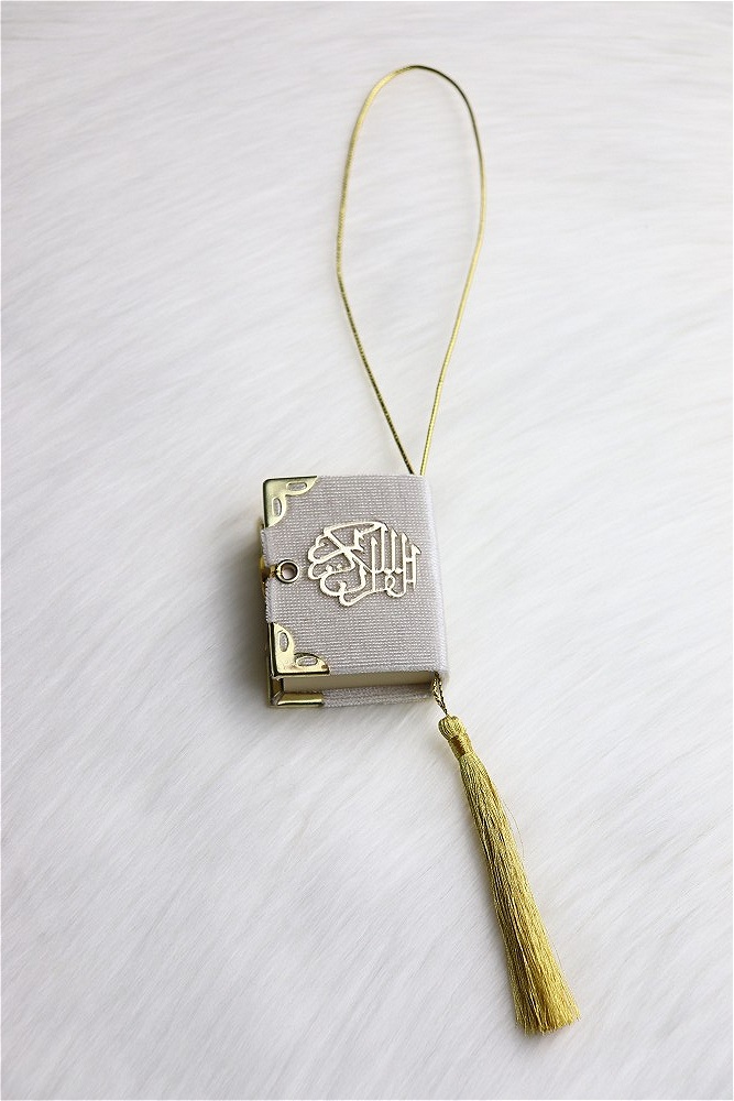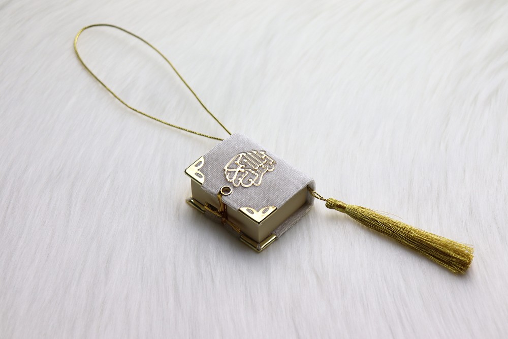 Pendentif Mini-Coran recouvert de velours avec parties dorées (Déco Islam) - Couleur beige - REF. 34502 (4.90 €)