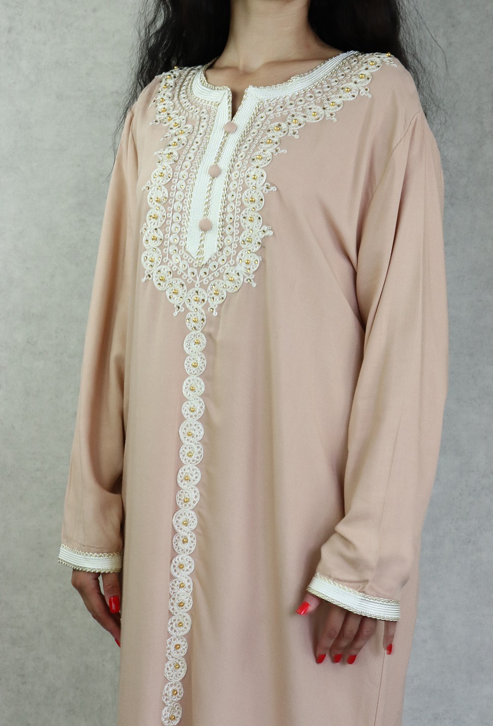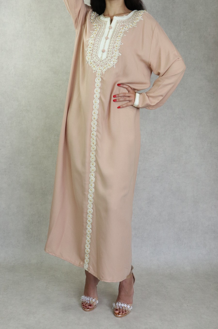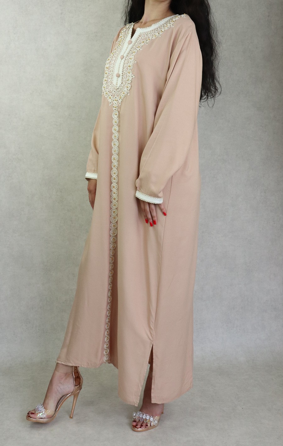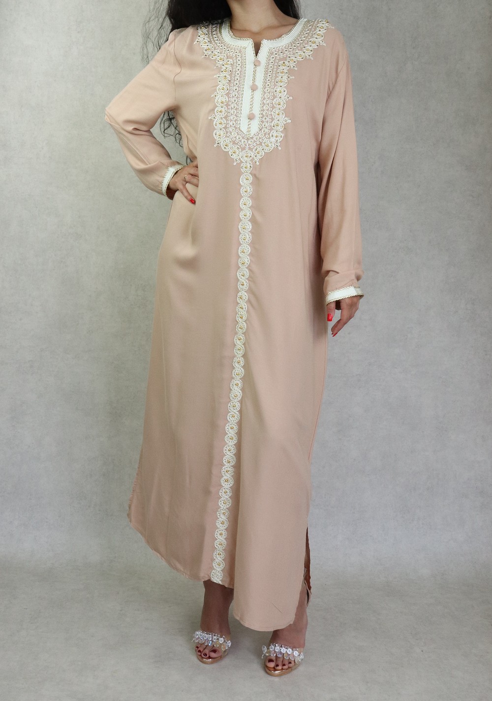 Robe Marocaine longue avec strass dorée et nombreuses broderies sur le buste et toute la longueur ; style caftan. Tissu doux de type coton/soie. Le double avantage de ce modèle est d'être confortable et élégant à la fois.