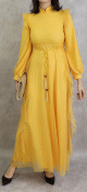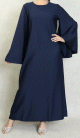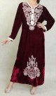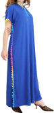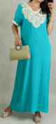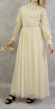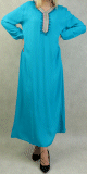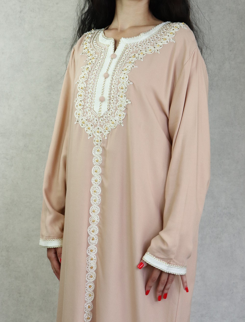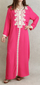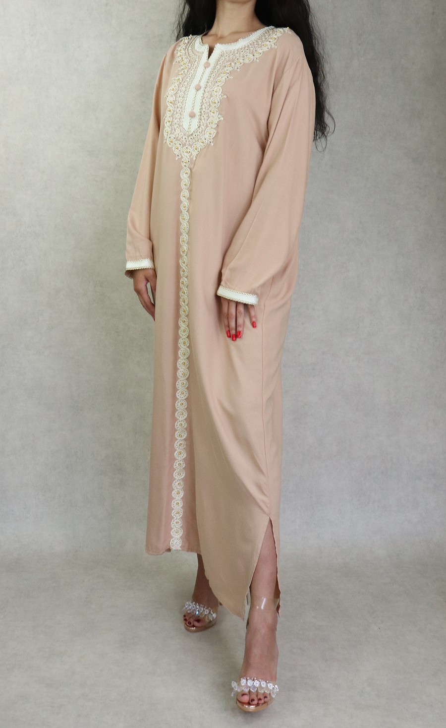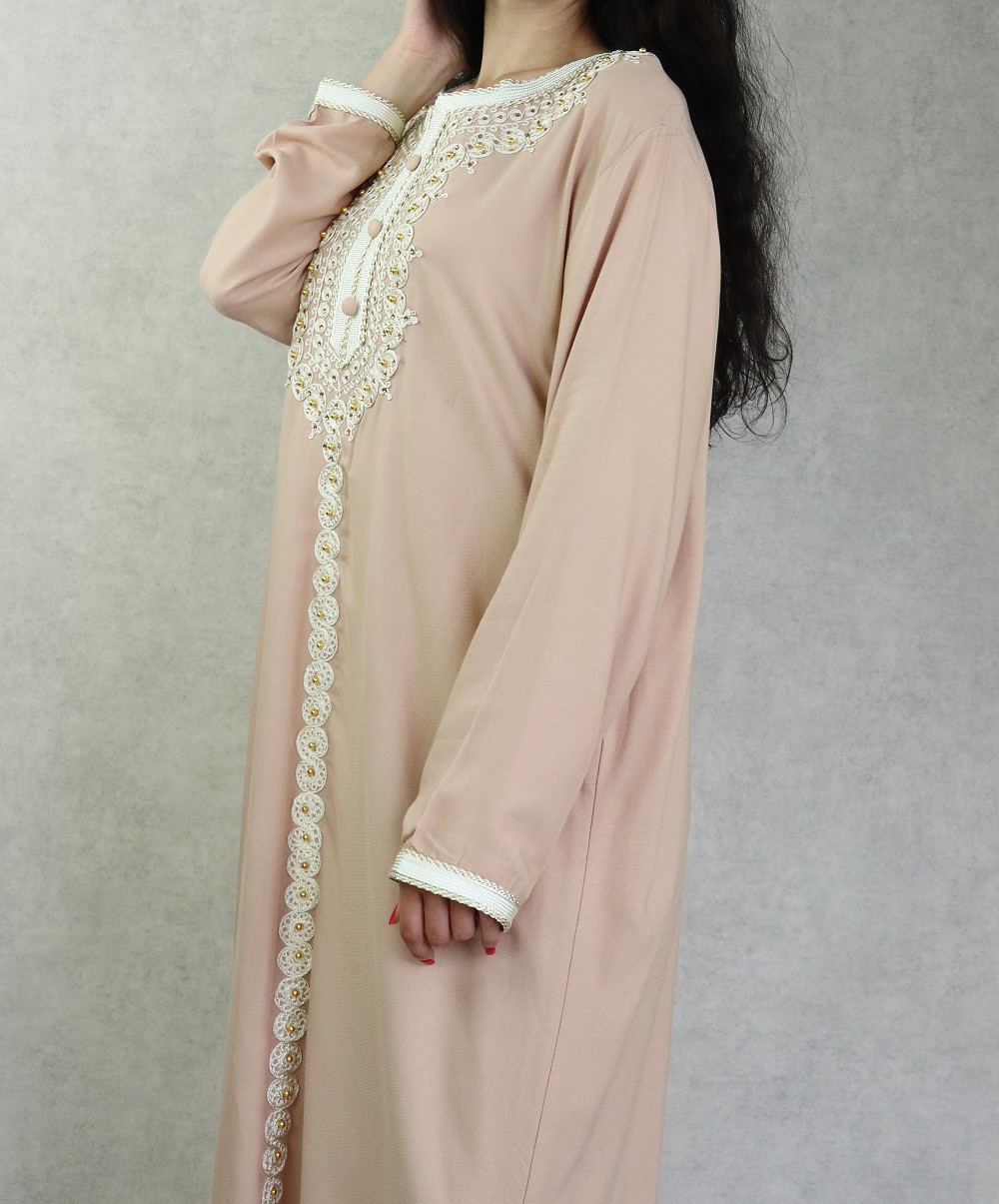 Robe Marocaine longue avec strass dorée et nombreuses broderies sur le buste et toute la longueur ; style caftan. Tissu doux de type coton/soie. Le double avantage de ce modèle est d'être confortable et élégant à la fois.