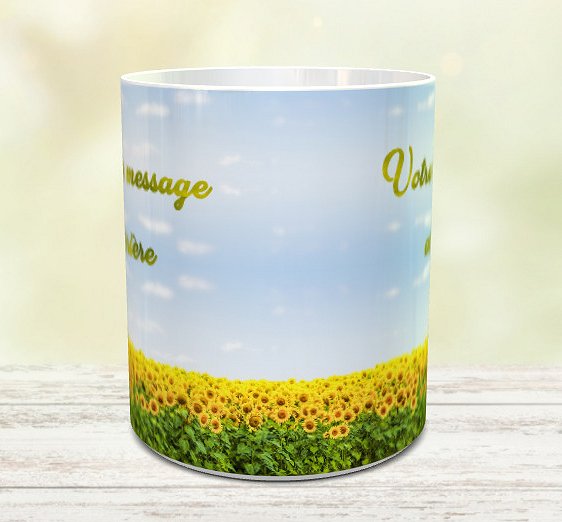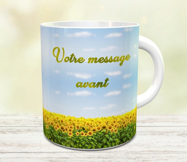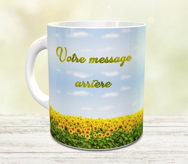 Tasse cadeau avec deux messages personnalises - Mug champs de tournesol sur fond de ciel et nuages (Made in France)