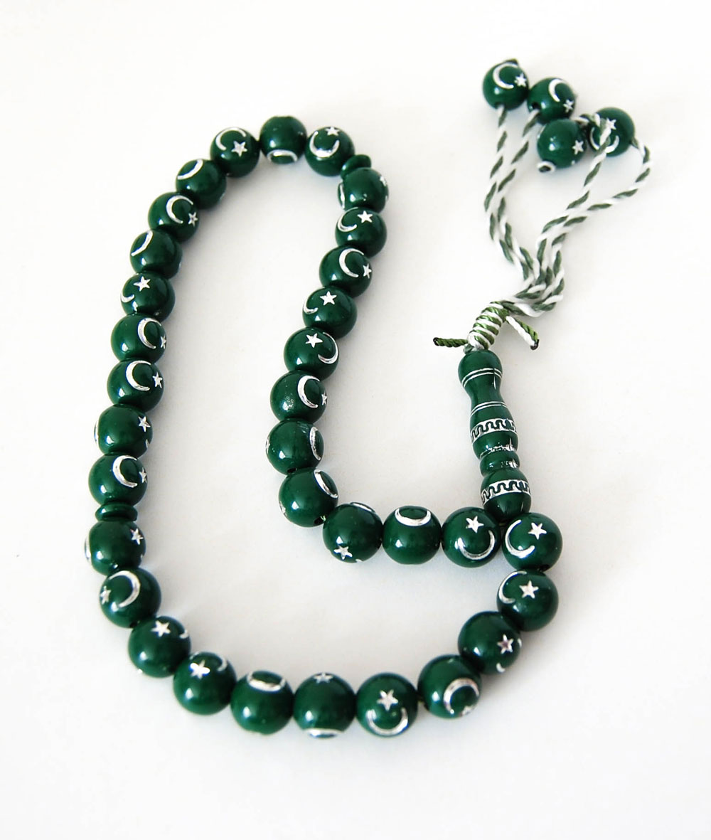 Chapelet "Sebha" vert a 33 gros grains avec motifs argentes