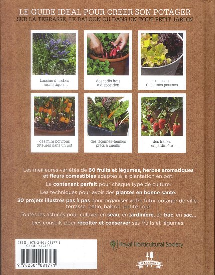 Comment transformer le plus petit lopin de terre en potager ? C'est ce qu'apprend ce livre à travers 30 projets pas à pas, richement illustrés. Une première partie présente les outils et les techniques spécialement adaptés à de petits espaces, et en particulier les méthodes de culture en pots. Puis on trouve : des explications pour chaque fruit, légume ou herbe aromatique qui peut pousser en pot ; quel pot choisir pour quelle culture et quelle variété ; les astuces pour avoir des plantations riches en goût et belles à voir ; des styles pour tous les types de petits jardins, balcons, terrasses, patios ; les techniques clé pour les bacs, les paniers suspendus, les sacs, les pots ; les incontournables pour prendre soin de ses plantations et régler les problèmes s'il en survient.