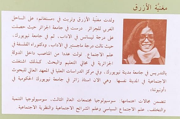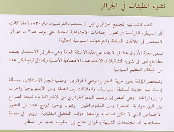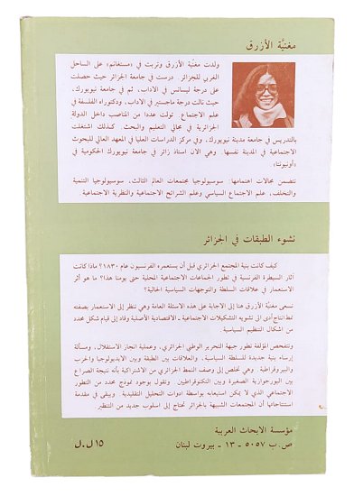 نشرت مغنية الأزرق هذا الكتاب الهام باللغة الإنجليزية في عام 1975، وترجم ونشر بالعربية في عام 1980، ينقسم هذا الكتاب إلى تسعة فصول، يتناول الفصل الأول الإطار النظري والمنهجي للدراسة، ويتعرض الفصلين الثاني والثالث إلى دراسة البنية الاجتماعية الجزائرية في ظل السيطرة التركية، والفرنسية، ونجد في الفصل الرابع، تحليلا لديناميات الطبقات الأولية، ويتناول الفصلين الخامس والسادس، المصالح والعلاقات الطبقية بعد الاستقلال، ويكشف الفصلين السابع والثامن أبعاد العلاقة بين الطبقة والحزب السياسي والبيروقراطية. ويقدم الفصل التاسع تلخيصا وعرضا للنتائج.