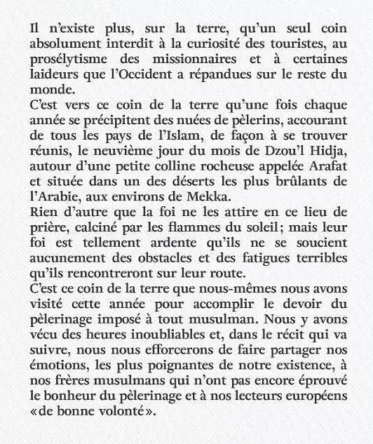 C'est vers cet endroit de la terre, qu'une fois par an, se précipitent des nuées de pèlerins, accourant de tous les pays, de façon à se trouver réunis, le neuvième jour du mois de Dzou'l Hidja, autour d'une petite colline rocheuse appelée Arafat et située dans un des déserts les plus brûlants de l'Arabie, aux environs de Mekka (La Mecque).