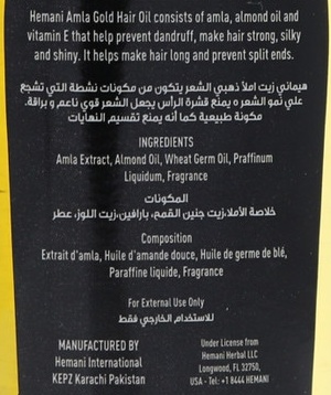 Amla Gold Hair Oil Se compose d'amla, d'huile d'amande et de vitamine E qui aident à prévenir les pellicules, rendent les cheveux forts, soyeux et brillants. Il aide à rendre les cheveux longs et forts.