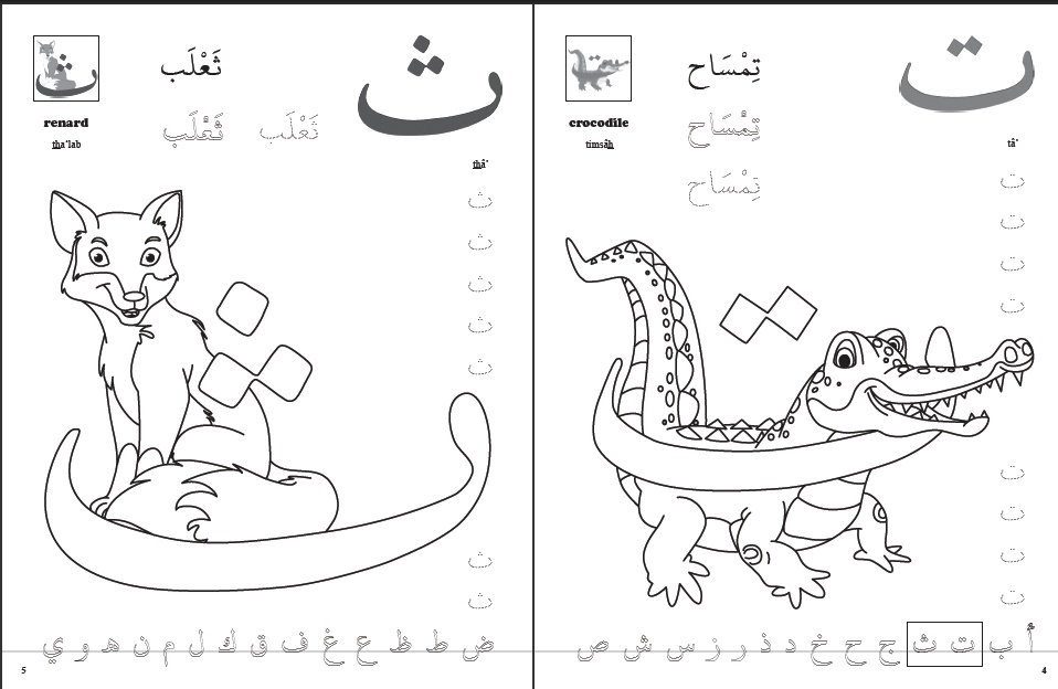 On retrouve, à la fin du livre, des pages d’écriture des lettres arabes avec leurs différentes formes (isolées, initiales, médianes et finales), ainsi que des mots simples combinant les lettres pour renforcer son apprentissage.