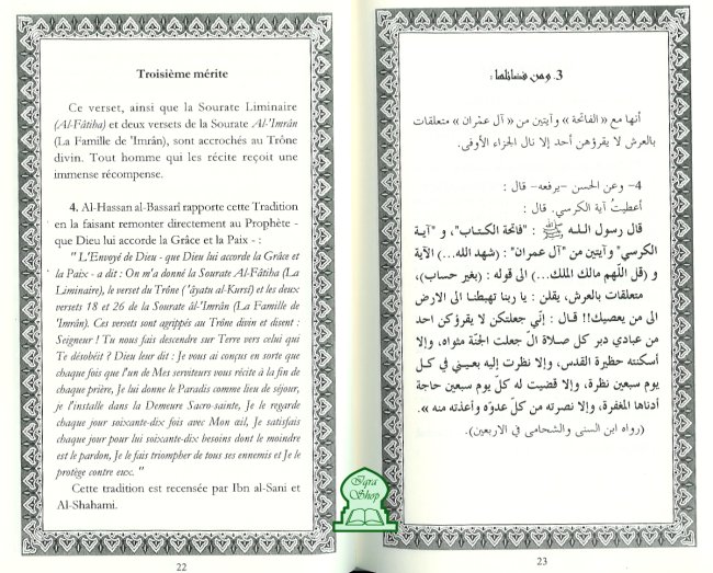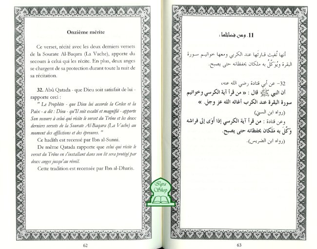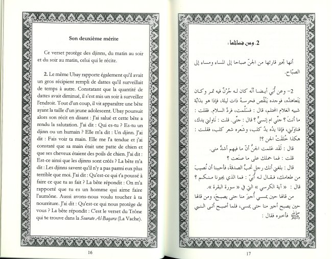 Ibn Mas'oud rapporte ceci : "Un homme a dit : O Envoyé de Dieu! Enseigne-moi quelque chose qui, par la grâce de Dieu, me soit profitable! Le Prophète (SBDL) lui dit : Récite le verset du Trône, car il te protègera toi et tes enfants et protègera ta maison et même ses alentours".