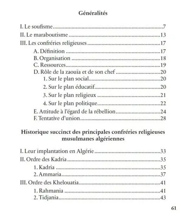 Le commandant Jacques Carret, arabisant et réputé pour la qualité de ses travaux ainsi que pour son impartialité fut chargé de mener une étude sur le maraboutisme. Il rédigea un compte-rendu complet sur les confréries religieuses, leurs organisations et leurs rôles, leur rapport à l’autorité française et l’historiographie des principales confréries présentes en Algérie. Après l’édition de son rapport sur l’Association des oulémas d’Algérie, la publication de celui-ci permettra aux lecteurs et aux chercheurs d’avoir un panorama complet du paysage religieux algérien pendant la colonisation.