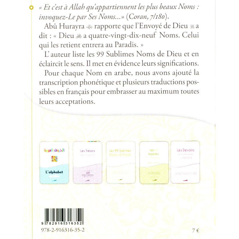 Les 99 Sublimes Noms d'Allah présentent une exploration essentielle des Noms divins. L'auteur liste les 99 Sublimes Noms de Dieu et en éclaircit le sens. Il met en évidence leurs significations. Pour chaque Nom en arabe, nous avons ajouté la transcription phonétique et plusieurs traductions possibles en français pour embrasser au maximum toutes leurs acceptations.