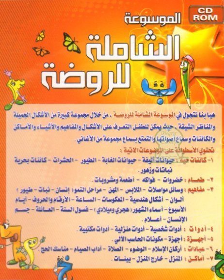 الموسوعة الشاملة للروضة عربي/English/Français * هيا بنا نتجول فى الموسوعة الشاملة للروضة، من خلال مجموعة كبيرة من الأشكال الجميلة والمناظر الشيقة، حيث يمكن للطفل التعرف على الأشكال والمفاهيم والأشياء والأماكن والكائنات وسماع أصواتها والتمتع بسماع مجموعة من الأغاني * تحتوي الأسطوانة على الموضوعات الأتية: 1- كائنات حية:حيوانات أليفة-حيوانات الغابة-الطيور-الحشرات-كائنات بحرية-نباتات وزهور. 2-طعام:خضروات-فواكه-أطعمة ومشروبات. 3-مفاهيم:وسائل مواصلات-الملابس-المهن-مراحل النمو(إنسان-نبات-طيور)ألوان-أشكال هندسية-المعكوسات-الساعة-الأرقام والحروف-أيام الأسبوع-أسماء الشهور (هجرىوميلادي)-فصول السنة-العائلة-جسم الإنسان-أعلام. 4-أدوات: أدوات شخصية-أدوات منزلية-أدوات مكتبية. 5-أجهزة:أجهزة-مكونات الحاسب الألي. 6-عبادات:أركان الإسلام-الوضوء-الصلاة-آداب الصيام-مناسك الحج. 7-أماكن:المنزل-خارج المنزل-بيئات.