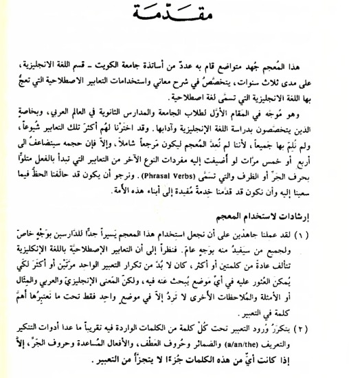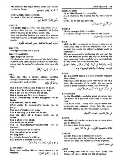 Il traduit les idiomes anglais en idiomes arabes, dans la mesure du possible, et en arabe standard autrement. Produit par un groupe de professeurs d'université d'anglais du monde arabe. Les expressions anglaises sont extraites d'un dictionnaire concis des idiomes anglais par Hodder et Stoughton et du Dictionary of English Idioms de Longman. Inclut également l'explication en anglais de chaque idiome, en utilisant parfois des exemples de phrases.