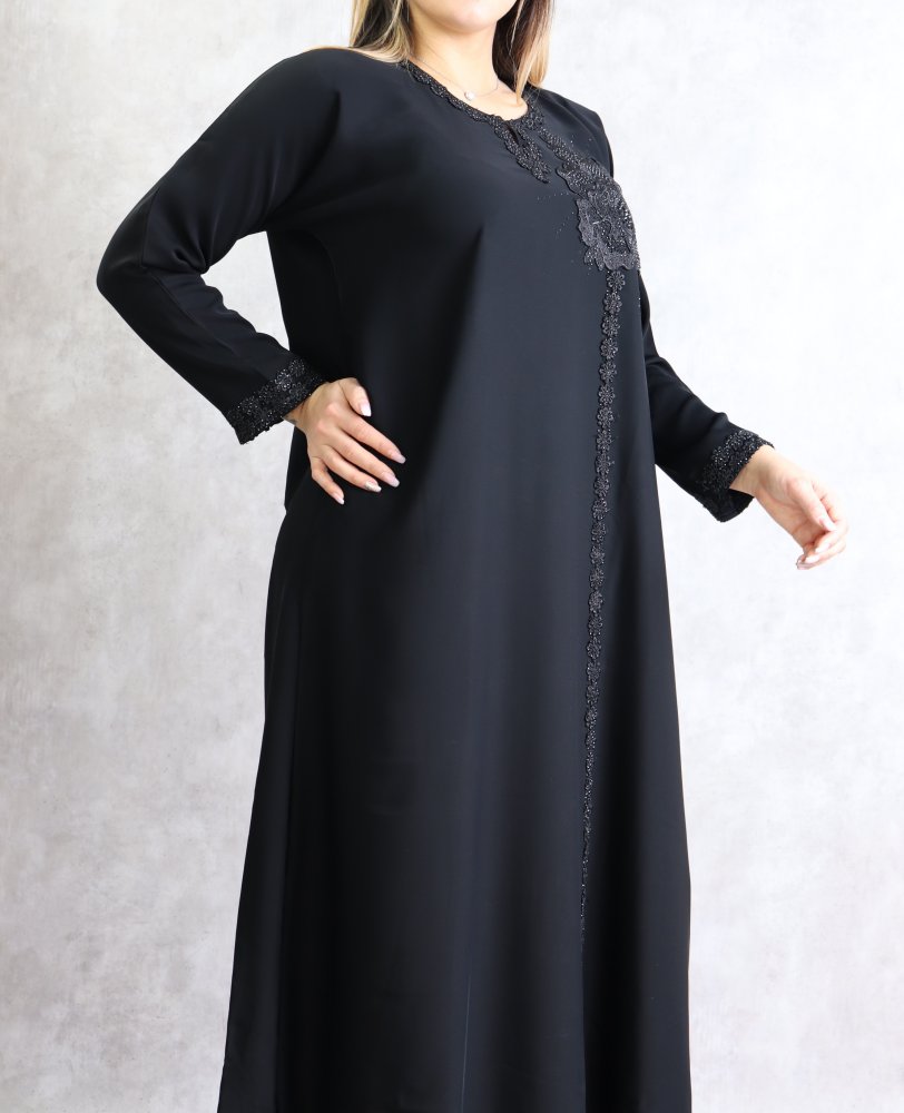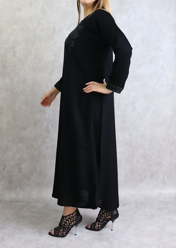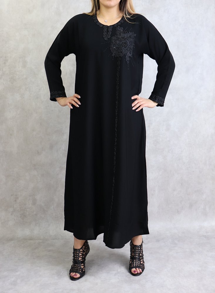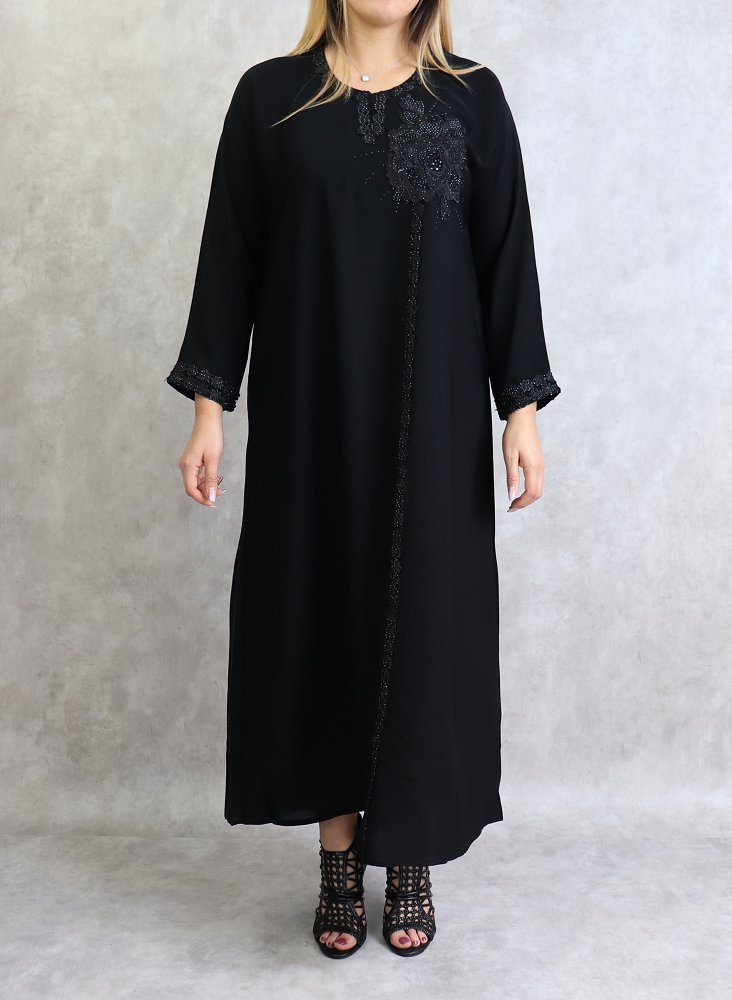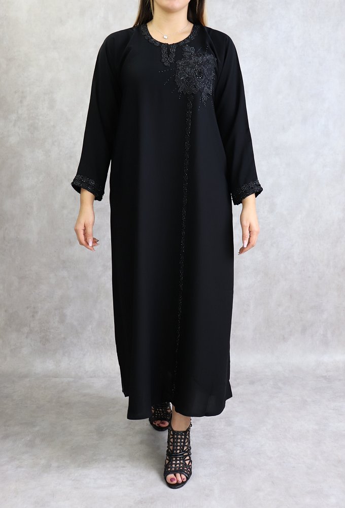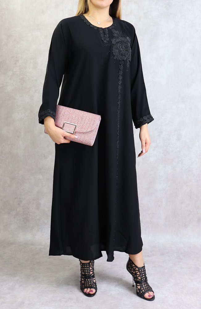 Abaya noire accompagnée d'une splendide broderie en forme de fleurs et de strass sur tout le coté gauche ainsi que sur les extrémités des manches. Foulard assorti (écharpe noire).