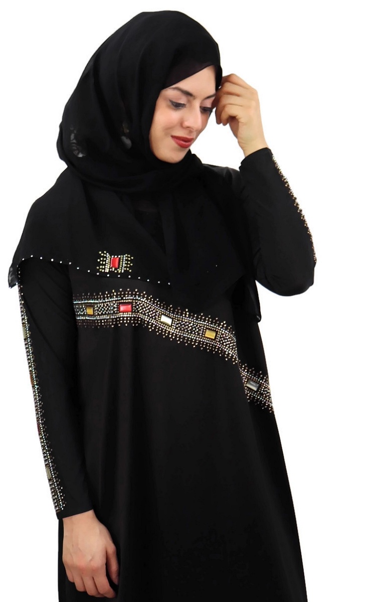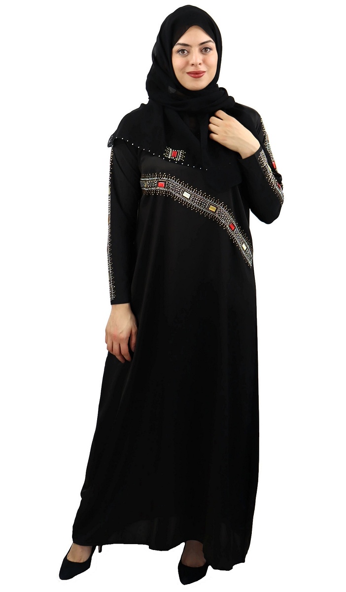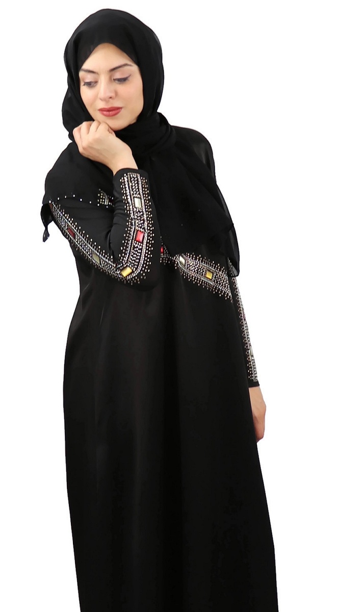 Abaya noire agrémentée de strass et rubis rouges jaunes blanc et dorés sur le devant ainsi que sur toute la longueur des manches.