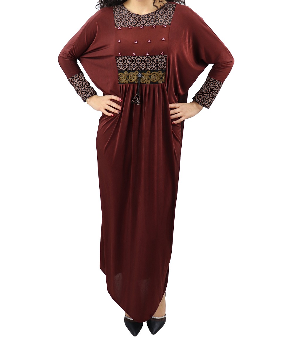 Abaya longue Marron avec broderies et perles (écharpe assortie) Vetement & Accessoire