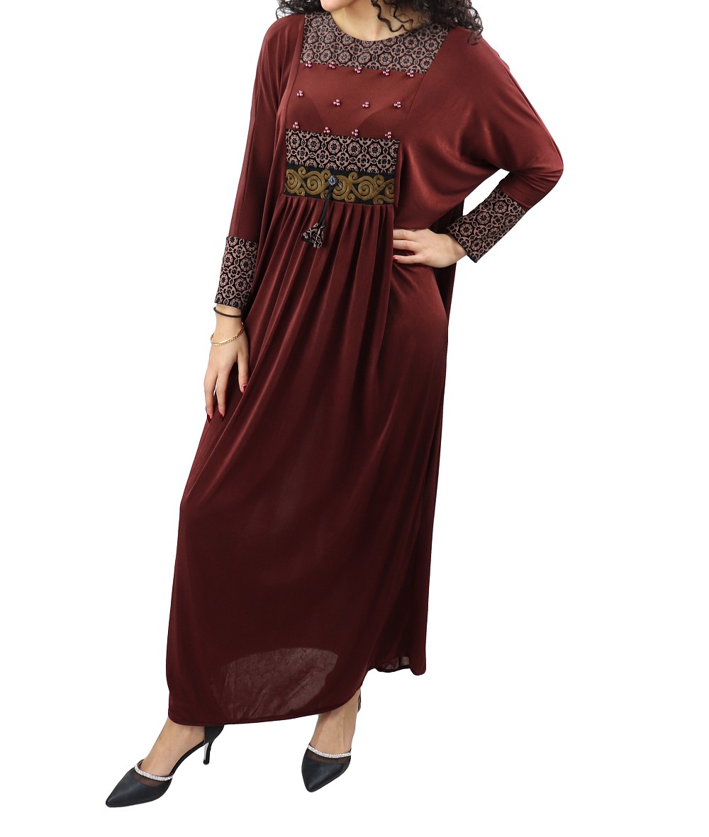 Abaya longue Marron avec broderies et perles (echarpe assortie)