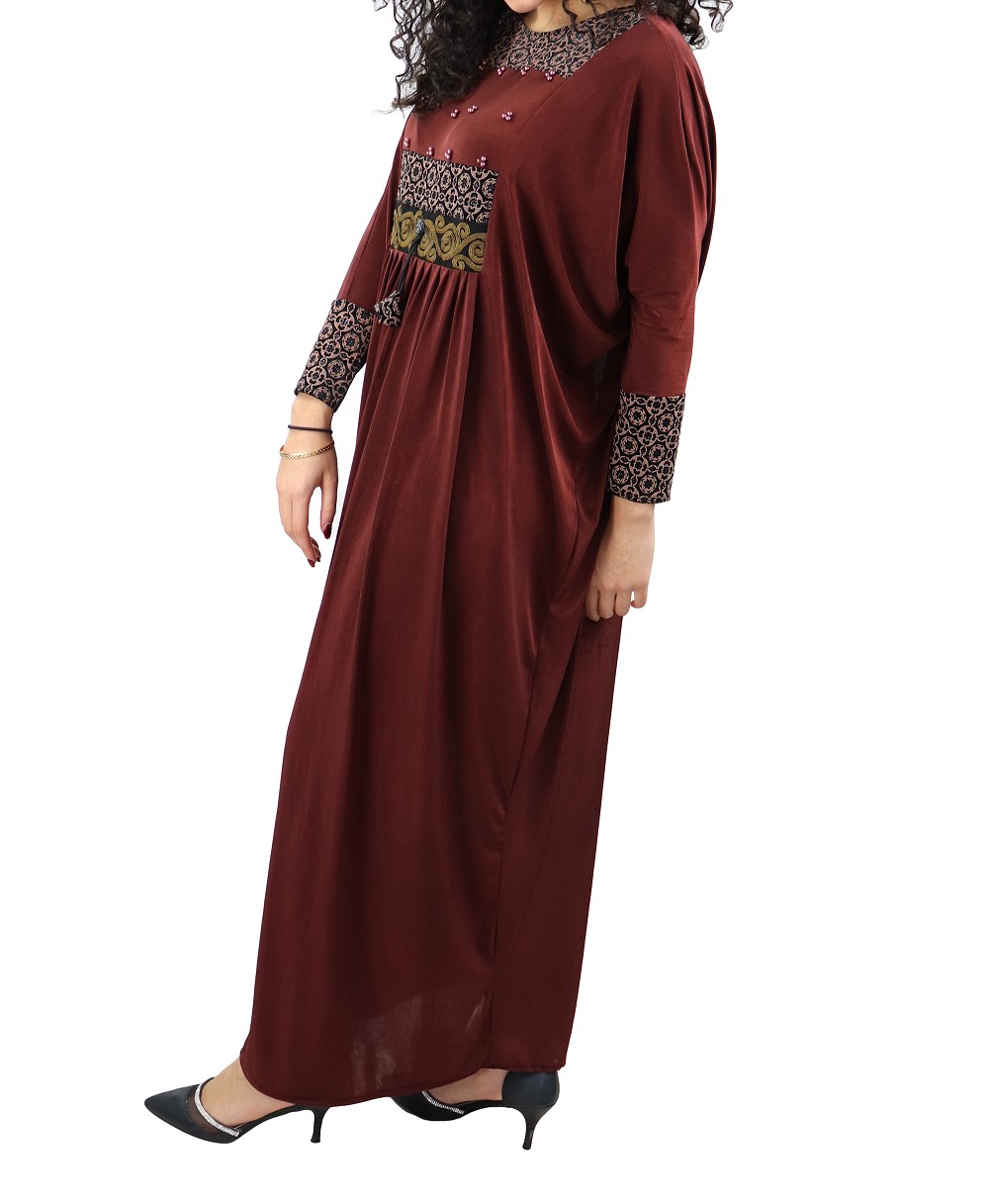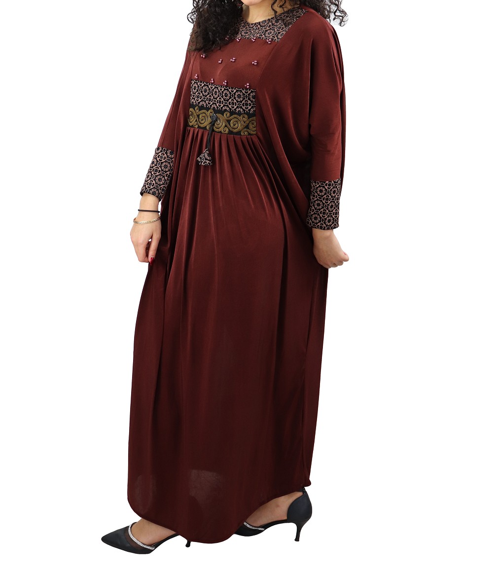 Abaya Marron agrémentée des broderie avec motifs brillants et perles sur le devant ainsi que sur les poignet, manches style papillons. Foulard assorti.