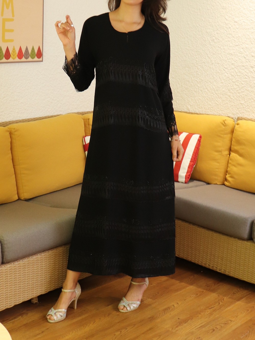Robe élégante maxi-longue bi-matière pour femme (Grande taille disponible) - Couleur noir / kaki - REF. 30803 (35.00 €)