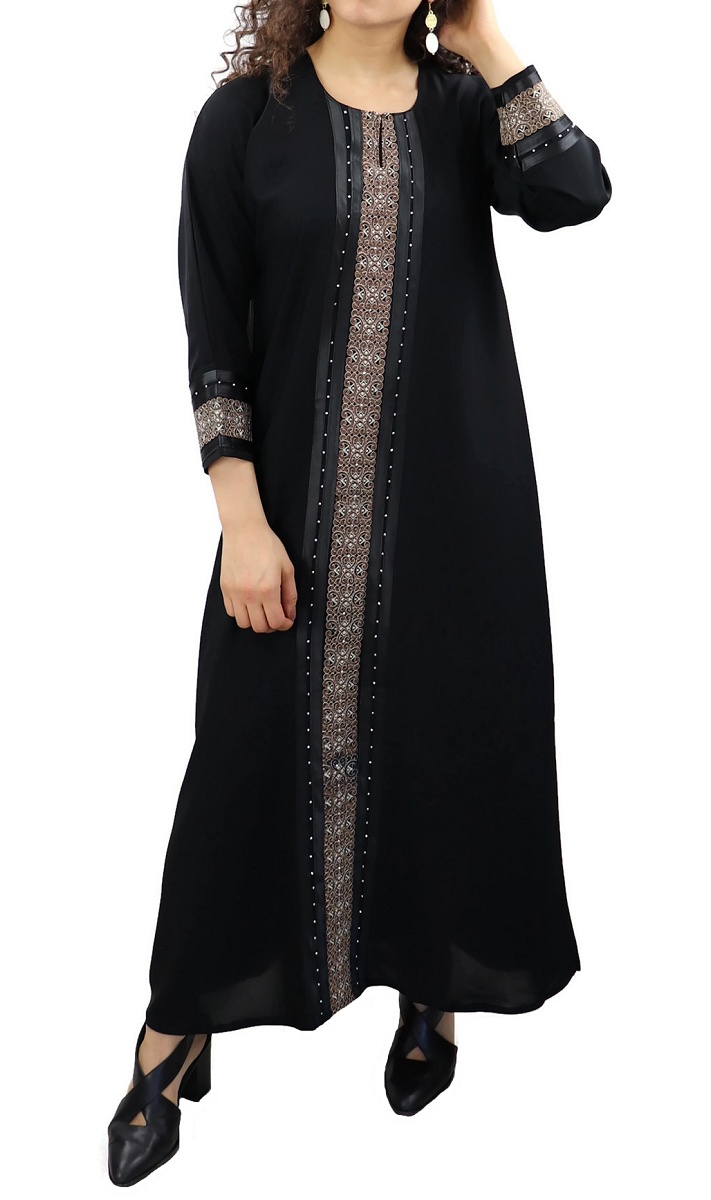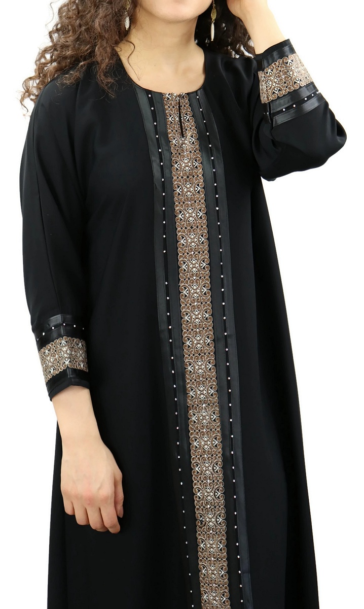 Abaya noire agrémentée de broderies marron et beige pailletées et de strass argentés sur toute la longueur ainsi que sur les extrémités des manches. Echarpe noire assortie.