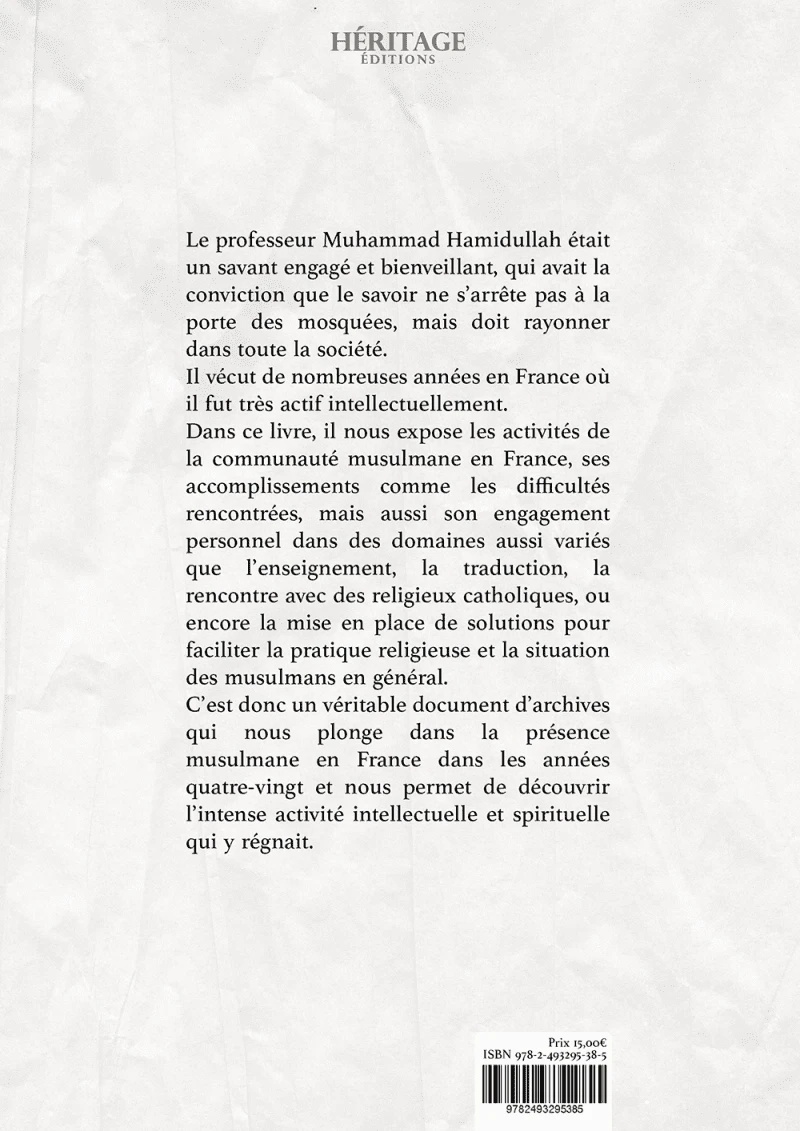 Le professeur Muhammad Hamidullah était un savant engagé et bienveillant, qui avait la conviction que le savoir ne s’arrête pas à la porte des mosquées, mais doit rayonner dans toute la société. Il vécut de nombreuses années en France où il fut très actif intellectuellement. Dans ce livre, il nous expose les activités de la communauté musulmane en France, ses accomplissements comme les difficultés rencontrées, mais aussi son engagement personnel dans des domaines aussi variés que l’enseignement, la traduction, la rencontre avec des religieux catholiques, ou encore la mise en place de solutions pour faciliter la pratique religieuse et la situation des musulmans en général. C’est donc un véritable document d’archives qui nous plonge dans la présence musulmane en France dans les années quatre-vingt et nous permet de découvrir l’intense activité intellectuelle et spirituelle qui y régnait.