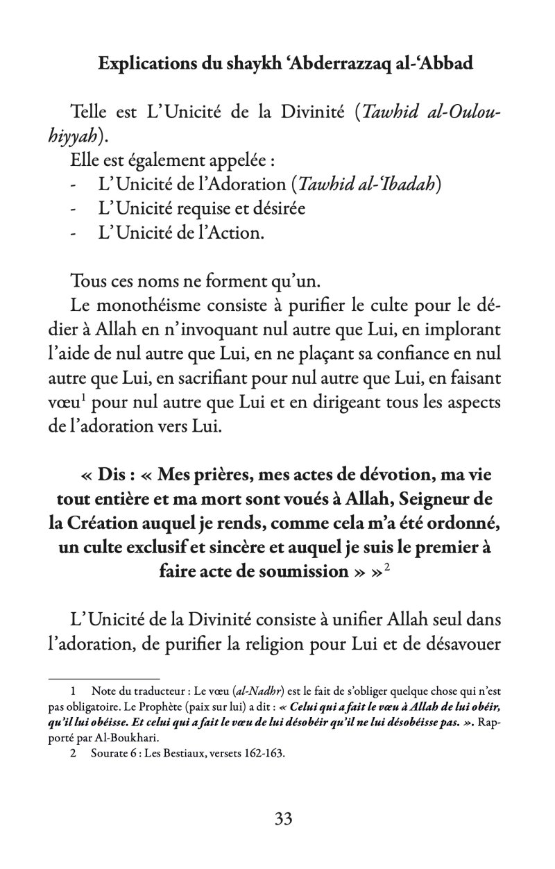 L’Unicité de la Divinité consiste à croire qu’Allah est le seul qui mérite d’être adoré et qu’Il n’a aucun rival en cela. Tel est le sens de « Nulle divinité n’est digne d’être adorée en dehors d’Allah. ». Cela signifie qu’il n’existe aucun véritable destinataire de culte en dehors d’Allah. Par conséquent, tous les actes d’adoration tels que la prière ou autre doivent absolument être sincèrement dédiés à Allah seul. Il n’est pas permis d’adresser un quelconque acte d’adoration à autre que Lui.
