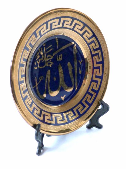Assiette decorative bleue en porcelaine avec la calligraphie "Allah" decoree de jolis motifs dores