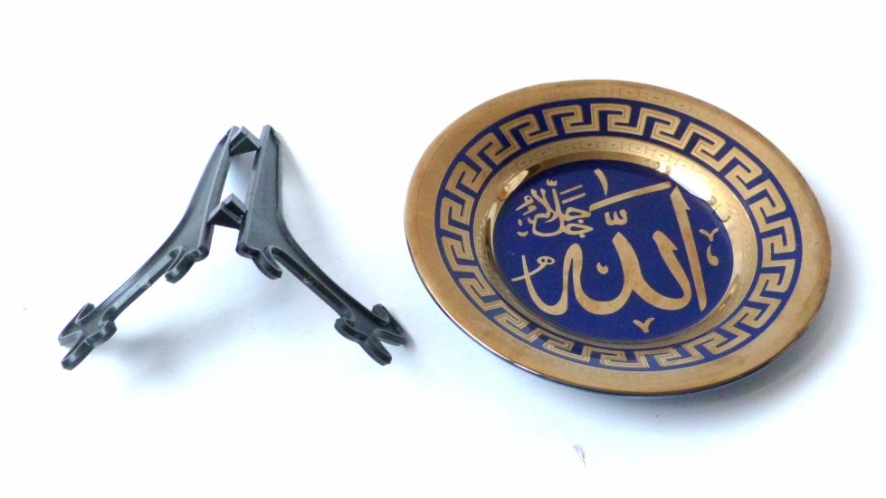 Assiette décorative bleue en porcelaine avec la calligraphie "Allah" décorée de jolis motifs dorés... Livrée avec son support.